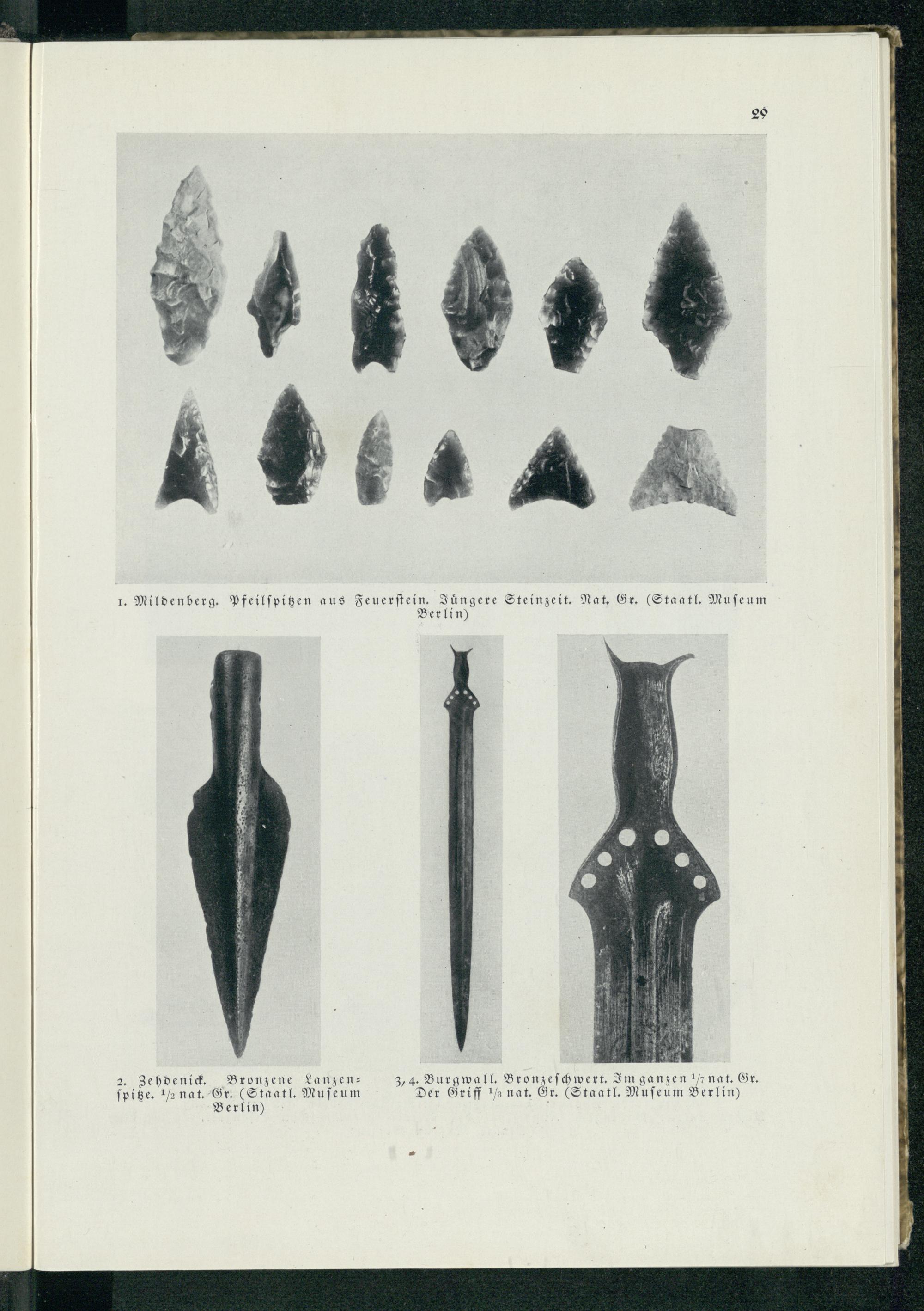 29 1. Mildenberg. Pfeilſpitzen aus Feuerſtein . Iüngere Steinzeit. Nat. Gr.(Staatl. Mufeum Berlin ) 2, Z3ehden d. Bronzene Sanzen: 3, 4. Burgwall. Bronzeſchwert. Im ganzen 1 nat. Gr. ſpitze. 1 nat. Gr.(Staatl. Mu ſeum Der Griff 13 nat. Gr.(Staatl. Muſeum Berlin ) Berlin )