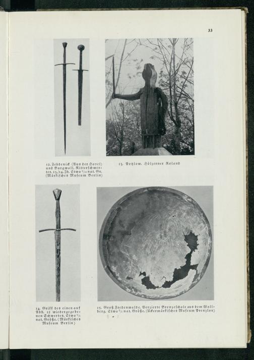 12. Zehdenick (Aus der Havel ) 13. Potzlow . Hoͤlzerner Roland und Burgwall. Ritterſchwerter. 13. 14. Ih. Etwa/ io nat. Gr. (Maͤrkiſches Muſeum Berlin )