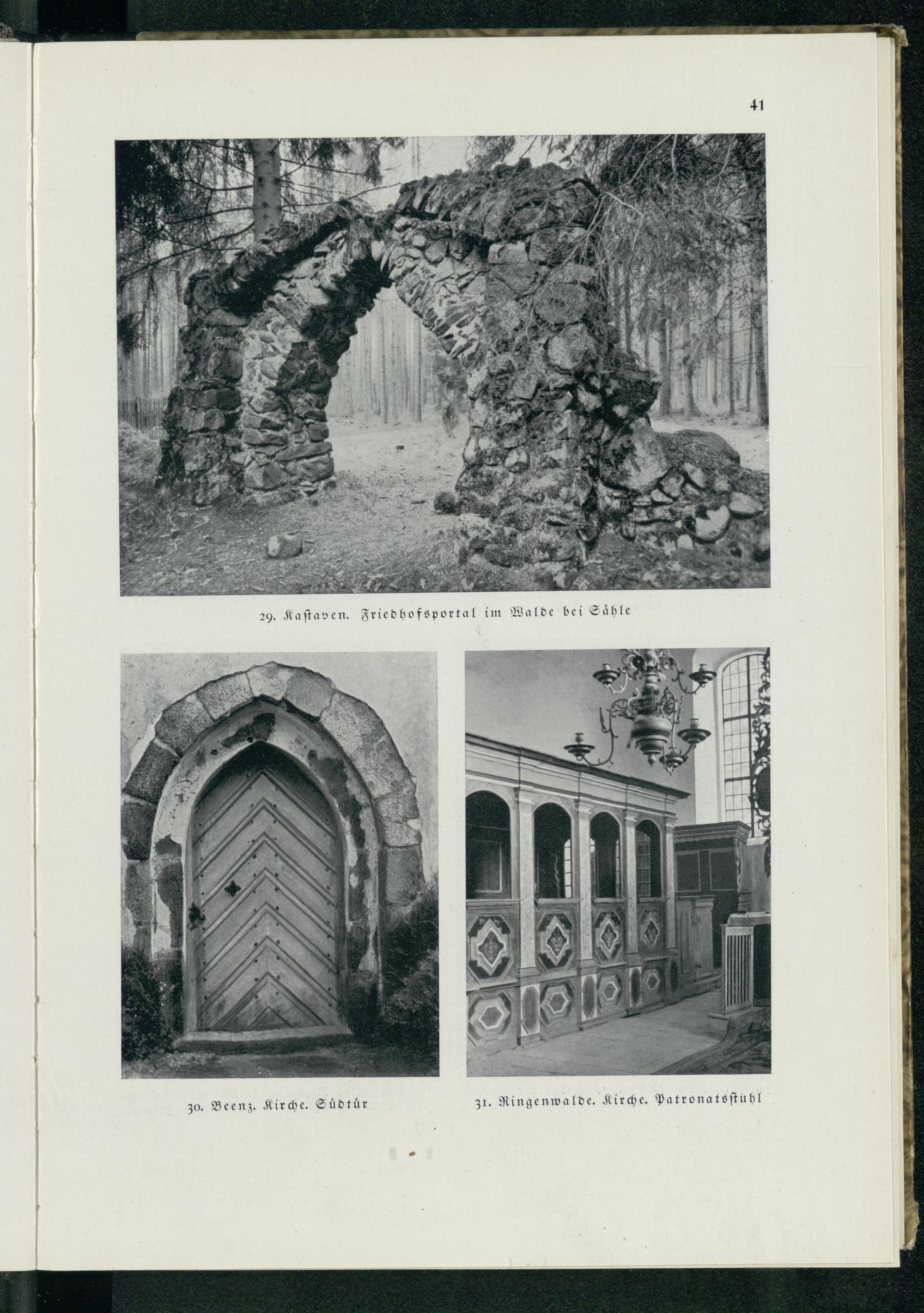 29. Kastaven. Friedhofsportal im Walde bei Sähle 30. Beenz. Kirche. Südtür 31. Ringenwalde. Kirche. Patronatsstuhl 41