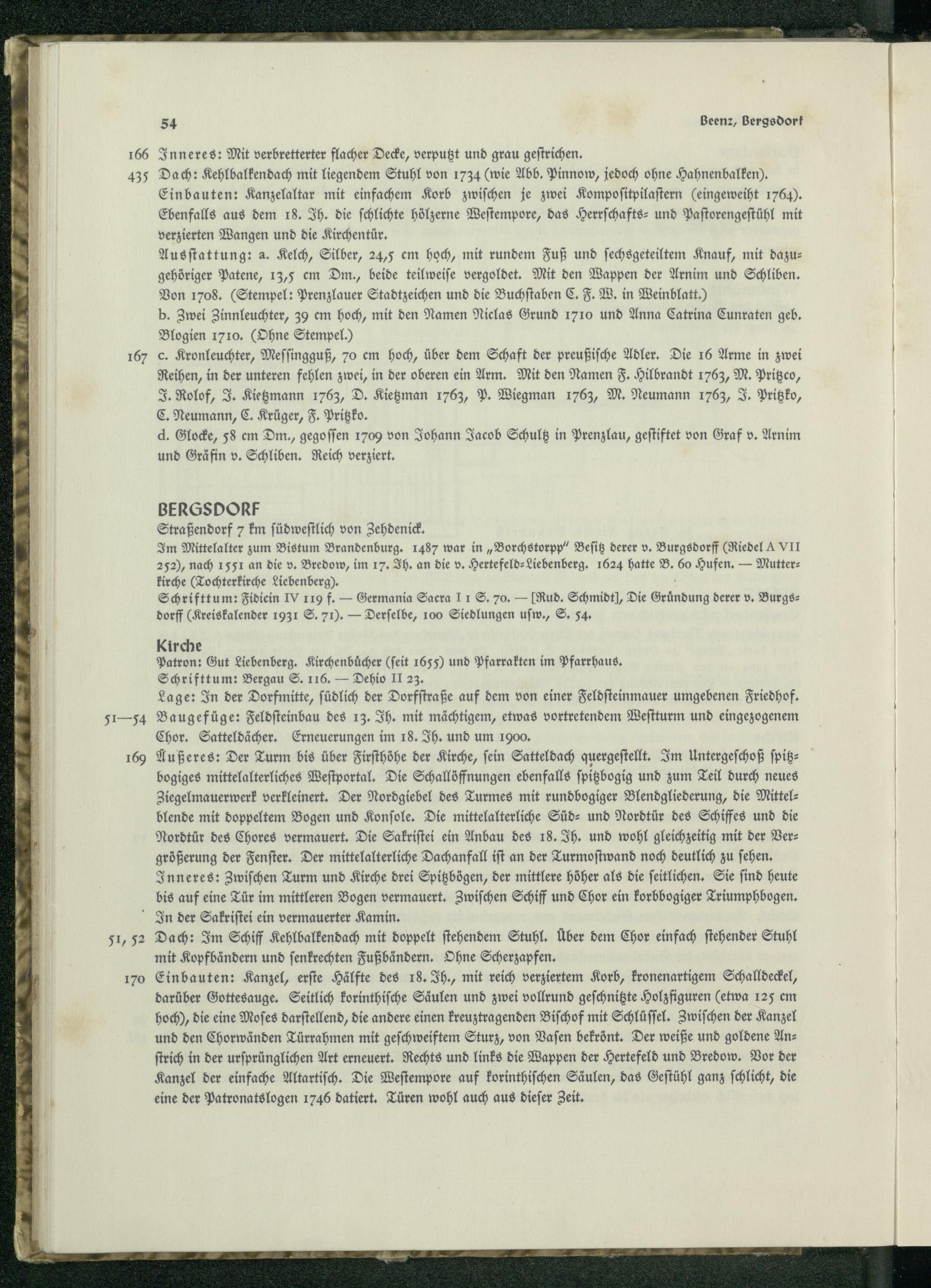 Im Mittelalter zum Bistum Brandenburg . 1487 war in„Borchstorpp“ Beſitz derer v. Burgsdorff (Riedel A VII 252), nach 1551 an die v. Bredow, im 17. Ih. an die v. Hertefeld⸗Liebenberg. 1624 hatte B. 60 Hufen.— Mutter: kirche(Tochterkirche Liebenberg)..
