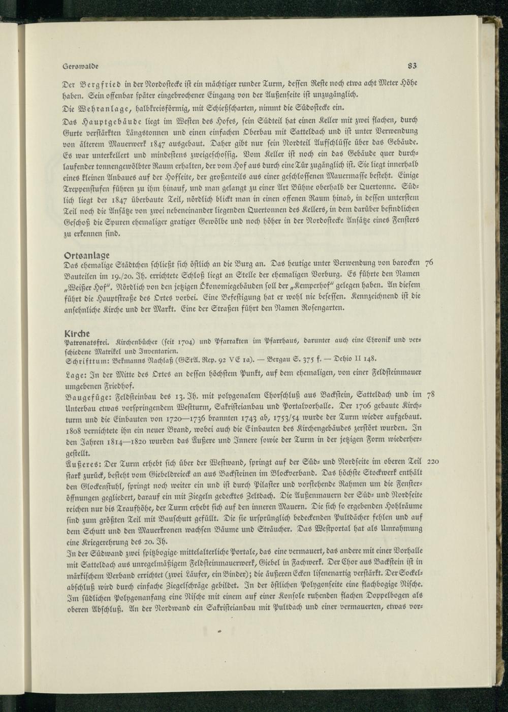 Baugefüge: Feldſteinbau des 13. Ih. mit polygonalem Chorſchluß aus Backſtein, Satteldach und im Unterbau etwas vorſpringendem Weſtturm, Sakriſteianbau und Portalvorhalle. Der 1706 gebaute Kirchturm und die Einbauten von 1720— 1736 brannten 1743 ab, 1753/54 wurde der Turm wieder aufgebaut. 1808 vernichtete ihn ein neuer Brand, wobei auch die Einbauten des Kirchengebäudes zerſtört wurden. In den Jahren 1814— 1820 wurden das Äußere und Innere ſowie der Turm in der jetzigen Form wiederhergeſtellt.