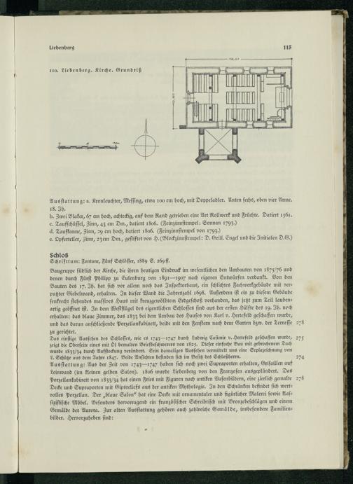 L. Schuͤtze aus dem Jahre 1847. Beide Anſichten befinden ſich im Beſitz des Schloßherrn. 274 Ausſtattung: Aus der Zeit von 1743— 1747 haben ſich noch zwei Supraporten erhalten, Griſaillen auf Leinwand(im kleinen gelben Salon). 1806 wurde Liebenberg von den Franzoſen ausgeplündert. Das Porzellankabinett von 1833/34 hat einen Fries mit Figuren nach antiken Vaſenbildern, eine zierlich gemalte 278 Decke und Supraporten mit Gipsreliefs aus der antiken Mythologie. In den Schränken befindet ſich wertvolles Porzellan. Der„blaue Salon“ hat eine Decke mit ornamentaler und figürlicher Malerei ſowie klaſſiziſtiſche Möbel. Beſonders hervorragend ein franzöſiſcher Schreibtiſch mit Bronzebeſchlägen und einem Gemälde der Aurora. Zur alten Ausſtattung gehören auch zahlreiche Gemälde, insbeſondere Familienbilder. Hervorzuheben ſind: