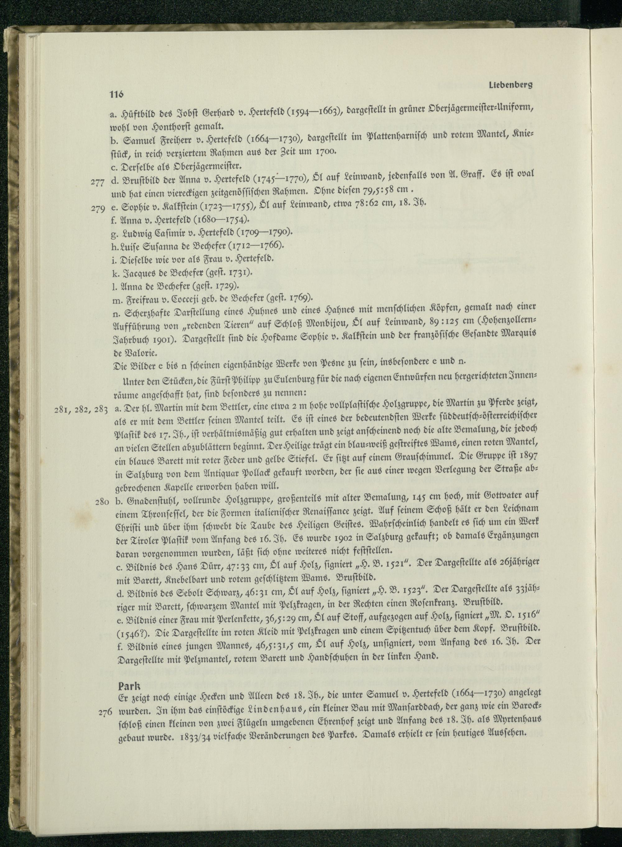 a. Hüftbild des Jobſt Gerhard v. Hertefeld(1594 1663, dargeſtellt in grüner Oberjägermeiſter⸗ Uniform, wohl von Honthorſt gemalt. b. Samuel Freiherr v. Hertefeld(1664— 1730, dargeſtellt im Plattenharniſch und rotem Mantel, Knieſtück, in reich verziertem Rahmen aus der Zeit um 1700. c. Derſelbe als Oberjägermeiſter. d. Bruſtbild der Anna v. Hertefeld(1745- 1770), Sl auf Leinwand, jedenfalls von A. Graff. Es iſt oval und hat einen viereckigen zeitgenöſſiſchen Rahmen. Ohne dieſen 79,5: 58 em. e. Sophie v. Kalkſtein(1723- 1759, Sl auf Leinwand, etwa 78: 62 em, 18. Ih. f. Anna v. Hertefeld(1680— 754). g. Ludwig Caſimir v. Hertefeld( 7.00- 70. h. Luiſe Suſanna de Bechefer([ 1712-= 1766). 1. Dieſelbe wie vor als Frau v. Hertefeld. k. Jacques de Bechefer(geſt. 1731): 1. Anna de Bechefer(geſt. 1729. m. Freifrau v. Cocceji geb. de Bechefer(geſt. 1769. n. Scherzhafte Darſtellung eines Huhnes und eines Hahnes mit menſchlichen Köpfen, gemalt nach einer Aufführung von„redenden Tieren“ auf Schloß Monbijou, SI auf Leinwand, 89: 125 em(HohenzollernJahrbuch 1901). Dargeſtellt find die Hofdame Sophie v. Kalkſtein und der franzöſiſche Geſandte Marquis de Valorie. Die Bilder e bis n ſcheinen eigenhändige Werke von Pesne zu ſein, insbeſondere e und n.