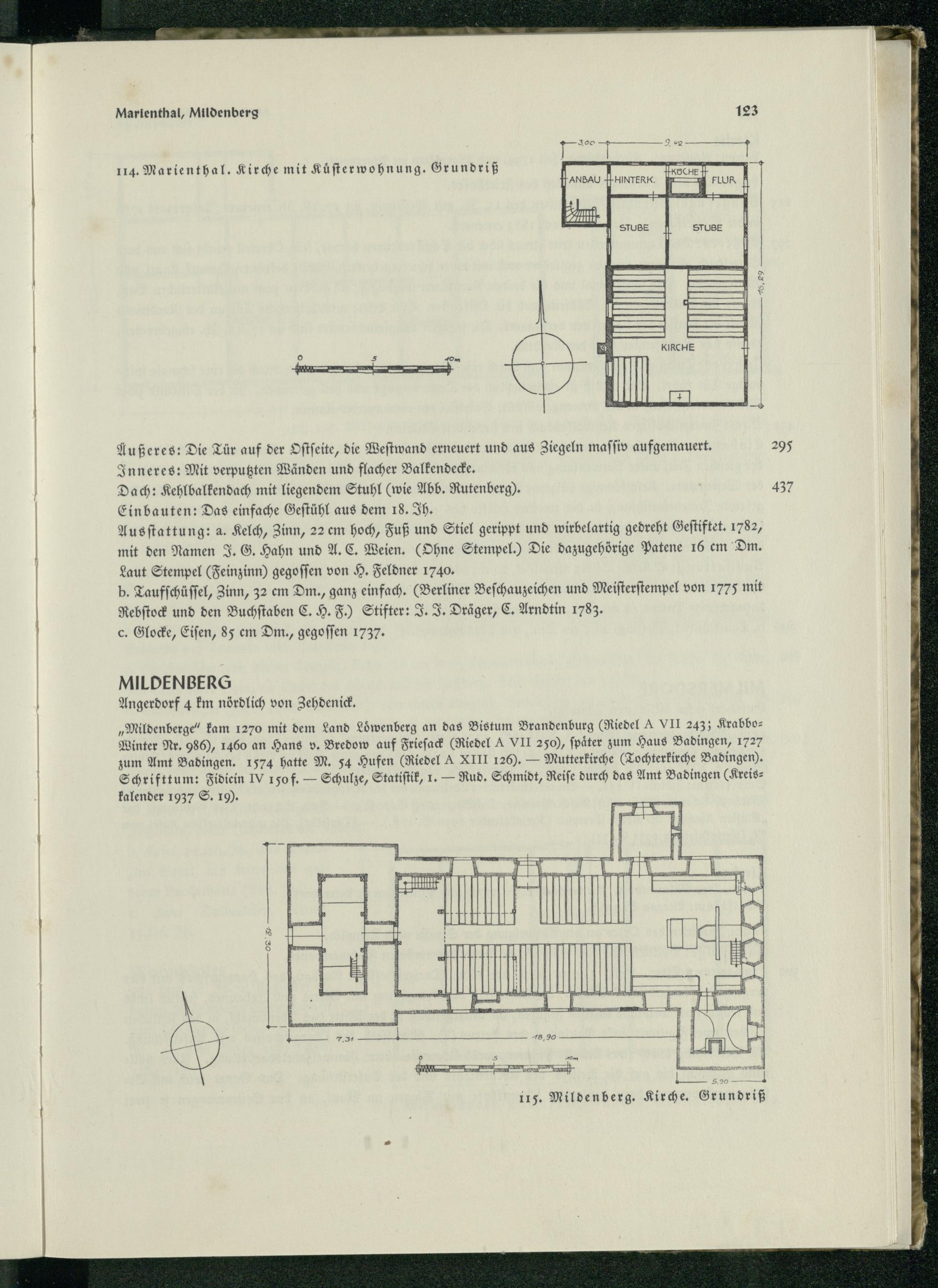 „Mildenberge“ kam 1270 mit dem Land Loͤwenberg an das Bistum Brandenburg (Riedel A VII 243; KrabboWinter Nr. 986), 1460 an Hans v. Bredow auf Frieſack (Riedel A VII 250, ſpaͤter zum Haus Badingen , 1727 zum Amt Badingen . 1574 hatte M. 54 Hufen(Riedel A XIII 126),— Mutterkirche(Tochterkirche Badingen). Schrifttum: Fidicin IV 150 f.— Schulze, Statiſtik, n— Rud. Schmidt, Reife durch das Amt Badingen (Kreiskalender 1937 S. 19.