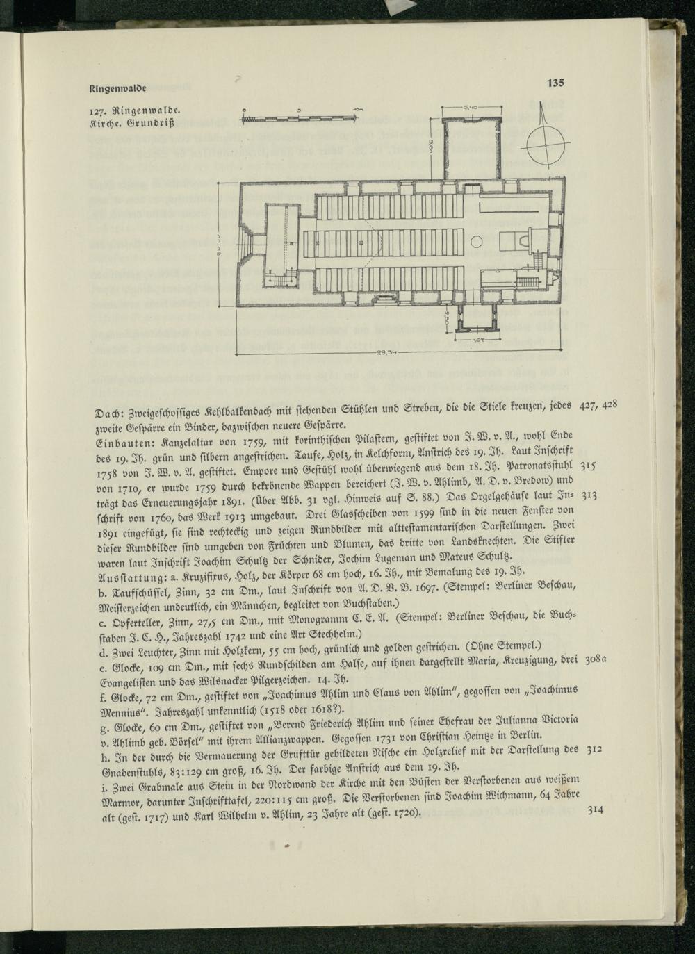 Einbauten: Kanzelaltar von 1759, mit korinthiſchen Pilaſtern, geſtiftet von J. W. v. A, wohl Ende des 19. Ih. grün und ſilbern angeſtrichen. Taufe, Holz, in Kelchform, Anſtrich des 15. h. Laut Inſchrift 1758 von J. W. v. A. geſtiftet. Empore und Geſtühl wohl überwiegend aus dem 18. Ih. Patronatsſtuhl von 1710, er wurde 1759 durch bekrönende Wappen bereichert(I. W. v. Ahlimb, A. D. v. Bredow) und trägt das Erneuerungsjahr 1891.(über Abb. 31 vgl. Hinweis auf S. 88 Das Orgelgehäuſe laut Inſchrift von 1760, das Werk 1913 umgebaut. Drei Glasſcheiben von 1599 find in die neuen Fenſter von 1891 eingefügt, fie find rechteckig und zeigen Rundbilder mit altteſtamentariſchen Darſtellungen. Zwei dieſer Rundbilder ſind umgeben von Früchten und Blumen, das dritte von Landsknechten. Die Stifter waren laut Inſchrift Joachim Schultz der Schnider, Jochim Lugeman und Mateus Schultz. Ausſtattung: a. Kruzifixus, Holz, der Körper 68 em hoch, 16. Ih, mit Bemalung des 19. Ih.
