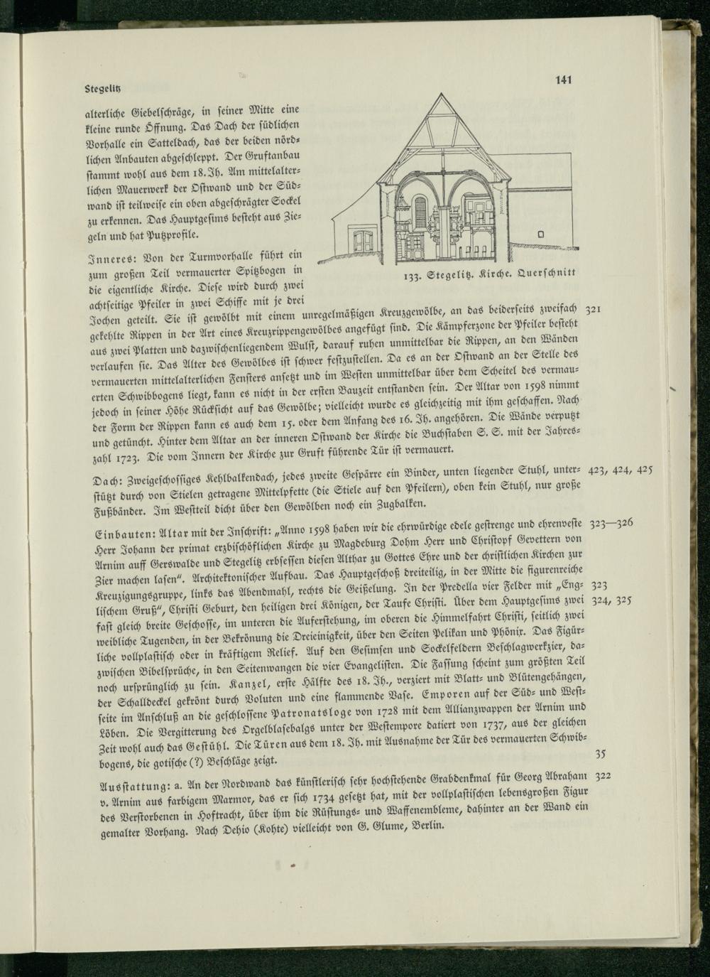 Einbauten: Altar mit der Inschrift:„ Anno 1598 haben wir die ehrwürdige edele gestrenge und ehrenveste 323-326 Herr Johann der primat erzbischöflichen Kirche zu Magdeburg Dohm Herr und Christopf Gevettern von Arnim auff Gerswalde und Stegeliß erbsessen diesen Althar zu Gottes Ehre und der christlichen Kirchen zur Zier machen lasen". Architektonischer Aufbau. Das Hauptgeschoß dreiteilig, in der Mitte die figurenreiche Kreuzigungsgruppe, links das Abendmahl, rechts die Geißelung. In der Predella vier Felder mit„ Eng- 323 lischem Gruß", Christi Geburt , den heiligen drei Königen, der Taufe Christi. Über dem Hauptgesims zwei 324, 325 fast gleich breite Geschosse, im unteren die Auferstehung, im oberen die Himmelfahrt Christi , seitlich zwei weibliche Tugenden, in der Bekrönung die Dreieinigkeit, über den Seiten Pelikan und Phönir. Das Figürliche vollplastisch oder in kräftigem Relief. Auf den Gesimsen und Sockelfeldern Beschlagwerkzier, dazwischen Bibelsprüche, in den Seitenwangen die vier Evangeliſten. Die Fassung scheint zum größten Teil noch ursprünglich zu sein. Kanzel, erste Hälfte des 18. Jh., verziert mit Blatt- und Blütengehängen, der Schalldeckel gekrönt durch Voluten und eine flammende Vase. Emporen auf der Süd- und Westseite im Anschluß an die geschlossene Patronatsloge von 1728 mit dem Allianzwappen der Arnim und Löben. Die Vergitterung des Orgelblasebalgs unter der Westempore datiert von 1737, aus der gleichen Zeit wohl auch das Gestühl. Die Türen aus dem 18. Jh. mit Ausnahme der Tür des vermauerten Schwibbogens, die gotische(?) Beschläge zeigt.