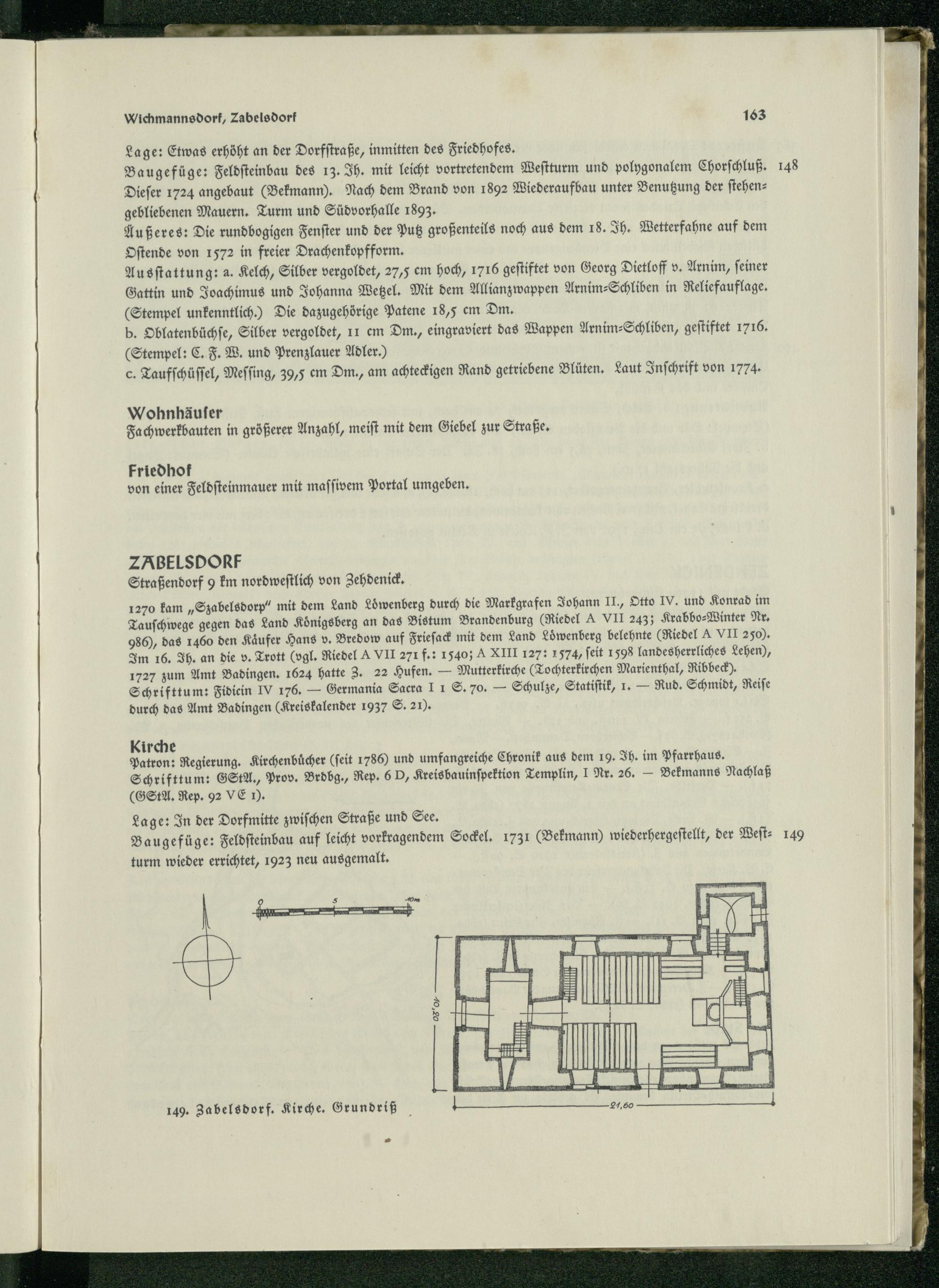 1270 kam„Szabelsdorp“ mit dem Land Löwenberg durch die Markgrafen Johann II., Otto IV. und Konrad im Tauſchwege gegen das Land Koͤnigsberg an das Bistum Brandenburg (Riedel A VII 243; Krabbo⸗Winter Nr. 986), das 1460 den Käufer Hans v. Bredow auf Frieſack mit dem Land Löwenberg belehnte(Riedel A VII 250. Im 16. Ih. an die v. Trott(vgl. Riedel A VII 271 f.: 1540; A XIII 127: 1574, ſeit 1598 landesherrliches Lehen), 1727 zum Amt Badingen . 1624 hatte 3. 22 Hufen.— Mutterkirche(Tochterkirchen Marienthal, Ribbeck). Schrifttum: Fidicin IV 176.— Germania Sacra 11 S. 70.— Schulze, Statiſtik, x.— Rud. Schmidt, Reife durch das Amt Badingen (Kreiskalender 1937 S. 2).