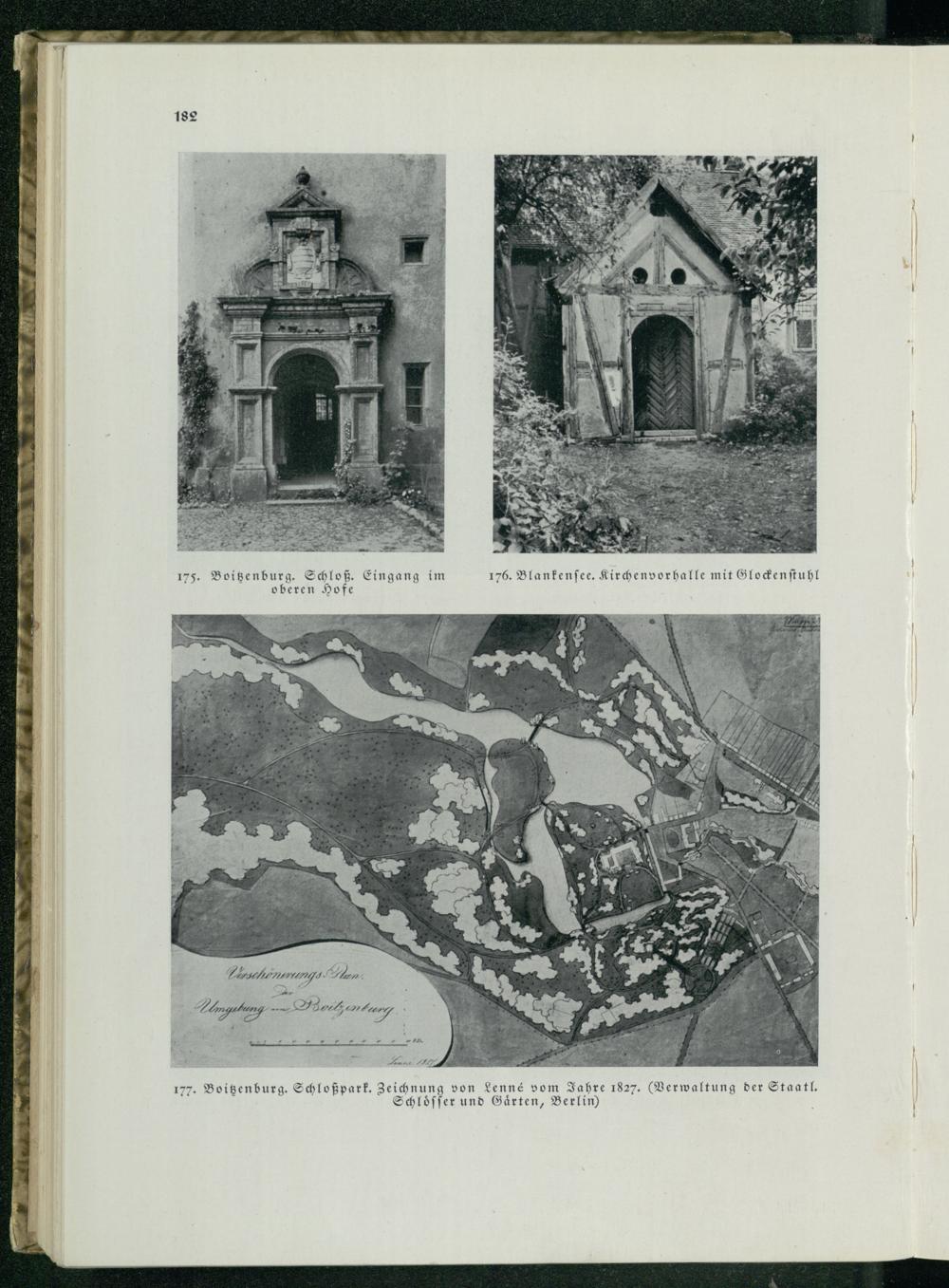 182 175. Boitzenburg . Schloß. Eingang im 176. Blankenſee. Kirchenvorhalle mit Glockenſtuhl oberen Hofe ö J K. 77. Boitzenburg. Schloßpark. Zeichnung von Lenné vom Jahre 1827.(Verwaltung der Staatl. Schloͤſſer und Gärten, Berlin )