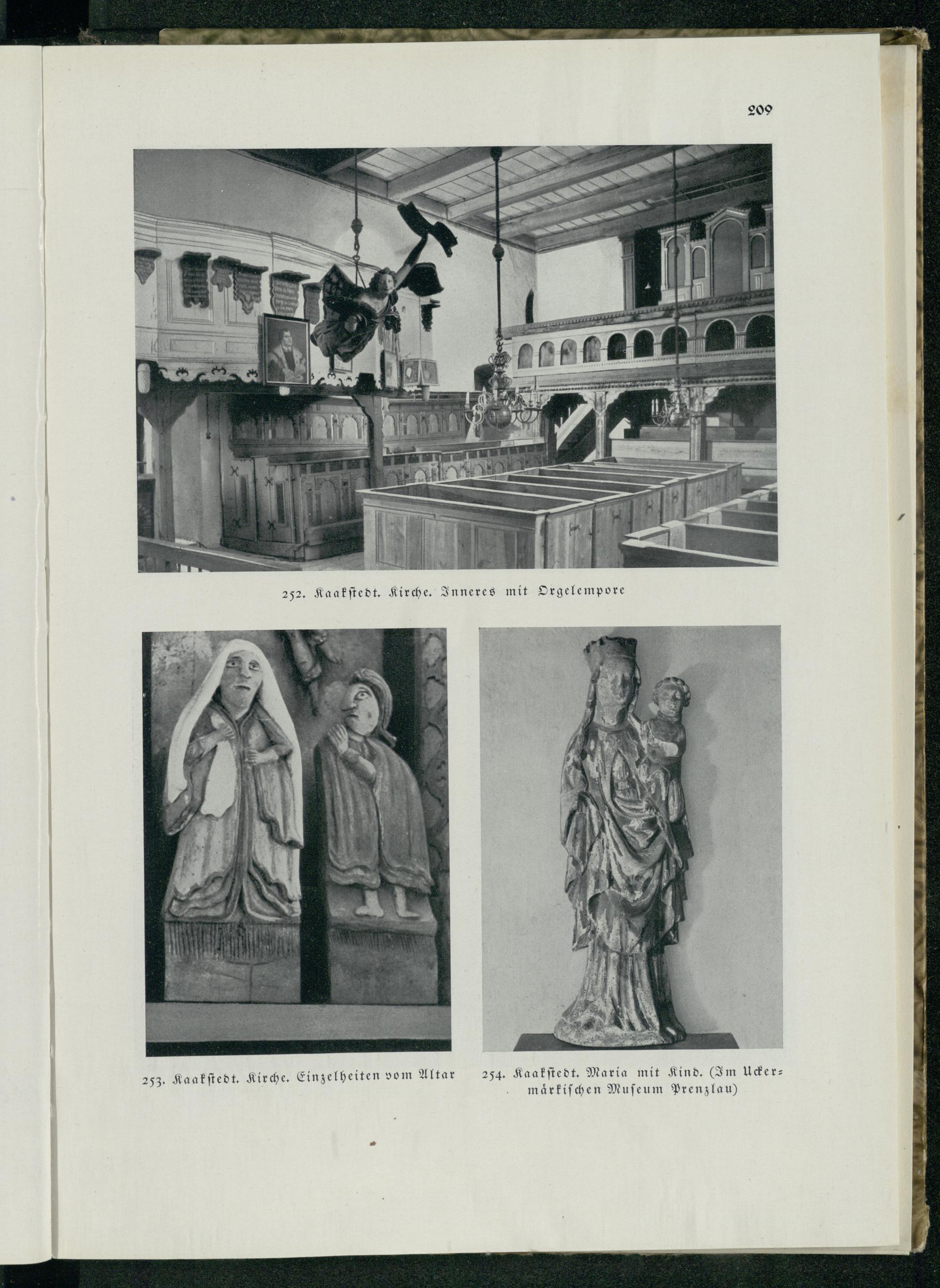 252. Kaakstedt. Kirche. Inneres mit Orgelempore L 253. Kaakstedt. Kirche. Einzelheiten vom Altar 209 254. Kaakstedt. Maria mit Kind.( Im Uckermärkischen Museum Prenzlau )