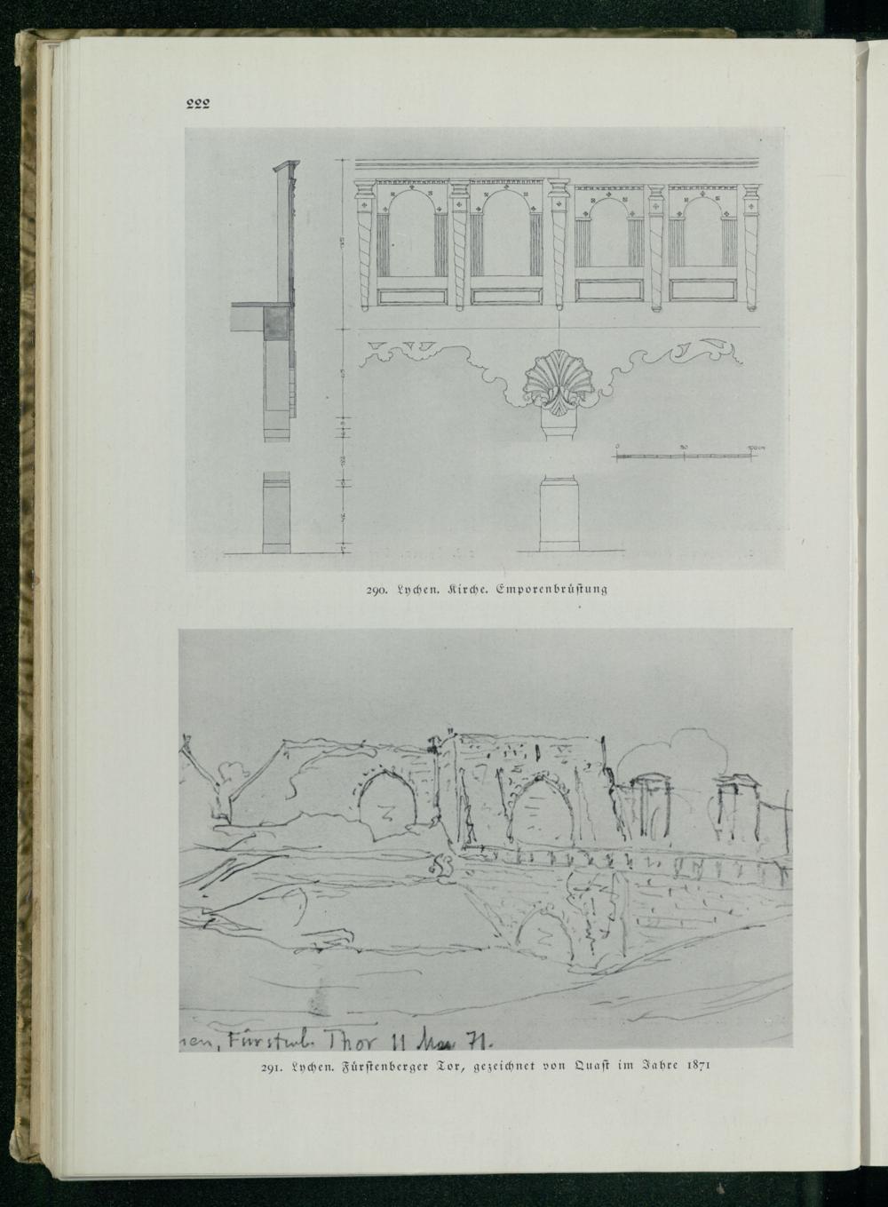 ——— 8 3 2 8+ 2——* = +| Hö+ 1. . 3 ö re. J || | ö| | j .} .— 290. Lychen . Kirche. Emporenbruͤſtung *. A K A H ö »! 9 . —.* 1% —. —— 6 a 7(— —. t ——. K € 291. Lychen. Fürftenberger Tor, gezeichnet von Quaſt im Jahre 1871
