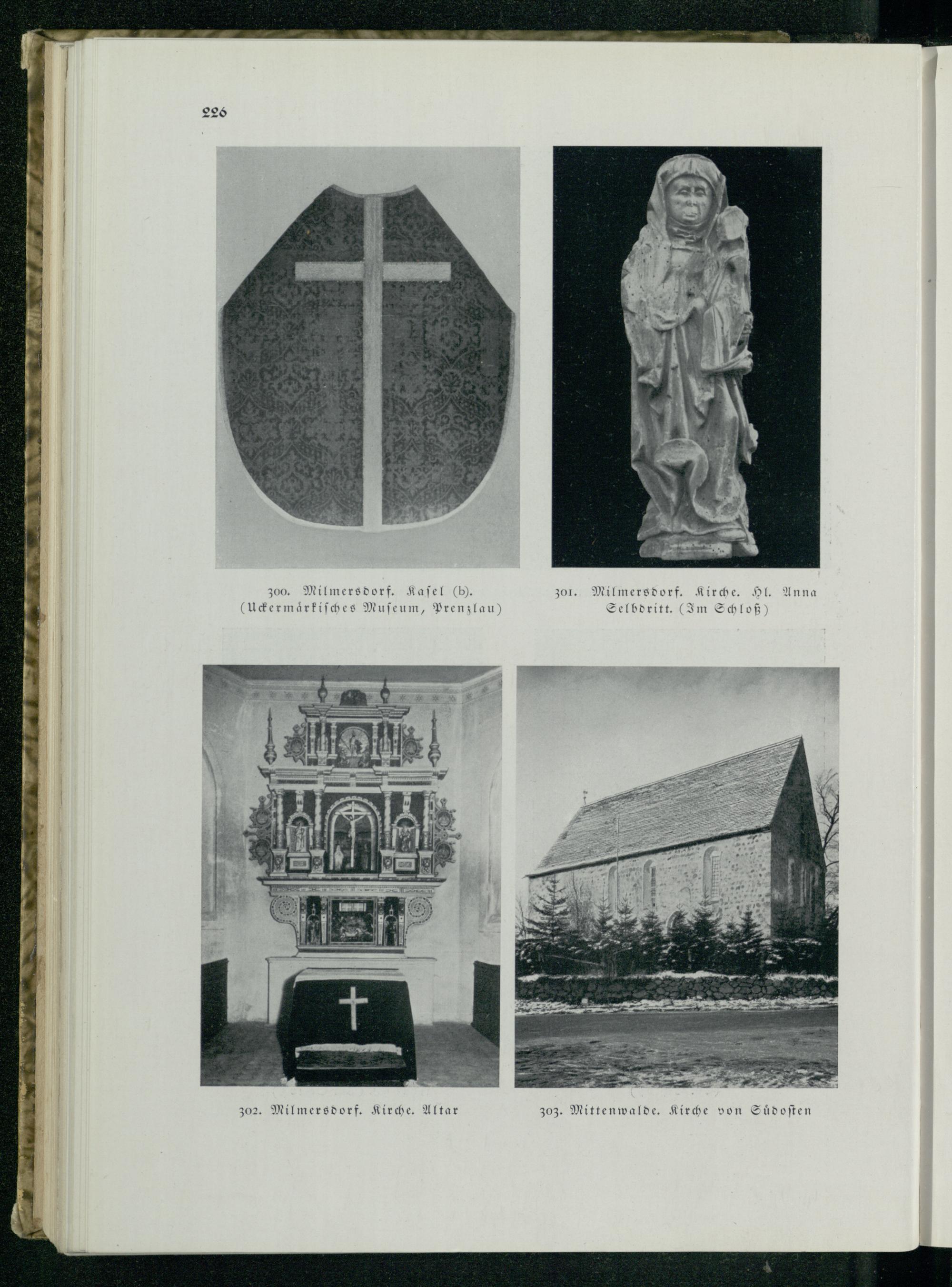 300. Milmersdorf . Kaſel (b. zo. Milmersdorf . Kirche. Hl. Anna Muſeum, Prenzlau ) Selbdritt.(Im Schloß) (Uckermaͤrkiſches 302. Milmersdorf. Kirche. Altar 303. Mittenwalde. Kirche von Suͤdoſten