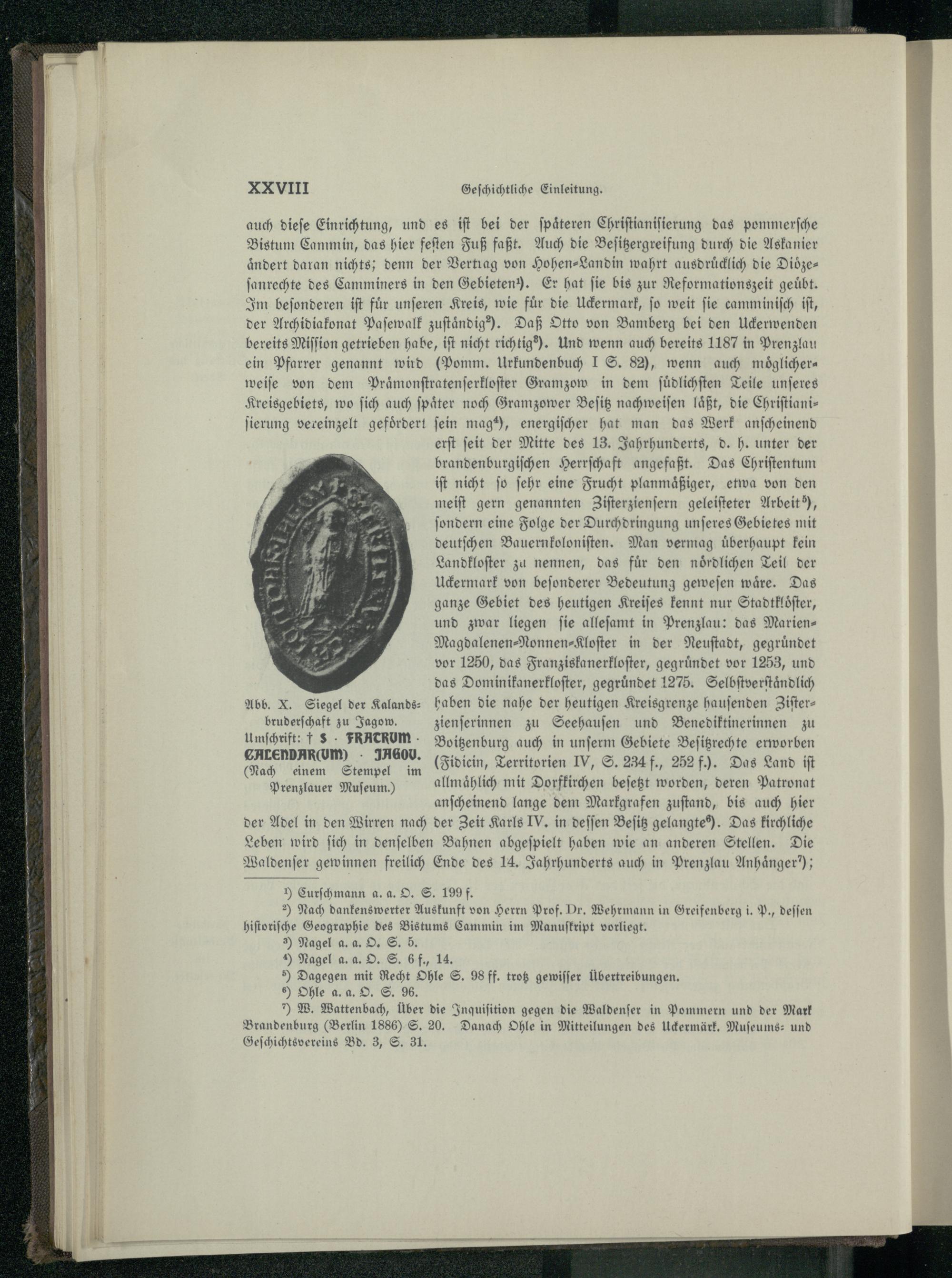 auch dieſe Einrichtung, und es iſt bei der ſpaͤteren Chriſtianiſierung das pommerſche Bistum Cammin, das hier feſten Fuß faßt. Auch die Beſitzergreifung durch die Askanier ändert daran nichts; denn der Vertrag von Hohen-Landin wahrt ausdrücklich die Diözeſanrechte des Camminers in den Gebieten). Er hat fie bis zur Reformationszeit geübt. Im beſonderen iſt fuͤr unſeren Kreis, wie fuͤr die Uckermark, ſo weit ſie camminiſch iſt, der Archidiakonat Paſewalk zuſtaͤndig'. Daß Otto von Bamberg bei den Uckerwenden bereits Miſſion getrieben habe, iſt nicht richtig'. Und wenn auch bereits 1187 in Prenzlau ein Pfarrer genannt wird(Pomm. Urkundenbuch 1 S. 82), wenn auch moͤglicherweiſe von dem Praͤmonſtratenſerkloſter Gramzow in dem ſuͤdlichſten Teile unſeres Kreisgebiets, wo ſich auch ſpaͤter noch Gramzower Beſitz nachweiſen laͤßt, die Chriſtianiſierung vereinzelt gefördert fein mag, energiſcher hat man das Werk anſcheinend erſt ſeit der Mitte des 13. Jahrhunderts, d. h. unter der brandenburgiſchen Herrſchaft angefaßt. Das Chriſtentum iſt nicht ſo ſehr eine Frucht planmaͤßiger, etwa von den meiſt gern genannten Ziſterzienſern geleiſteter Arbeit?, ſondern eine Folge der Durchdringung unſeres Gebietes mit deutſchen Bauernkoloniſten. Man vermag uͤberhaupt kein Landkloſter zu nennen, das für den noͤrdlichen Teil der Uckermark von beſonderer Bedeutung geweſen waͤre. Das ganze Gebiet des heutigen Kreiſes kennt nur Stadtkloͤſter, und zwar liegen ſie alleſamt in Prenzlau : das MarienMagdalenen⸗Nonnen⸗Kloſter in der Neuſtadt, gegruͤndet vor 1250, das Franziskanerkloſter, gegründet vor 1253, und das Dominikanerkloſter, gegruͤndet 1275. Selbſtverſtaͤndlich Abb. X. Siegel der Kalands- haben die nahe der heutigen Kreisgrenze hauſenden Ziſterbruderſchaft zu Jagow. zienſerinnen zu Seehauſen und Benediktinerinnen zu Umſchrift: 3 5Rkhckom. Boitzenburg auch in unſerm Gebiete Beſitzrechte erworben . aan(Sidiein, Territorien IV, S. 34 f, 252 f. Das Land iſ Prenzlauer Muſeum.) allmaͤhlich mit Dorfkirchen beſetzt worden, deren Patronat anſcheinend lange dem Markgrafen zuſtand, bis auch hier