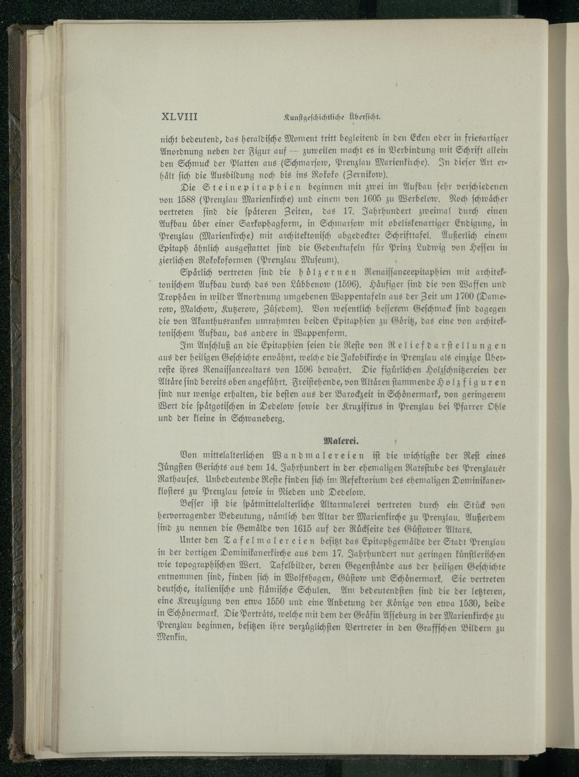 Die Steinepitaphien beginnen mit zwei im Aufbau ſehr verſchiedenen von 1588(Prenzlau Marienkirche ) und einem von 1605 zu Werbelow. Noch ſchwaͤcher vertreten ſind die ſpaͤteren Zeiten, das 17. Jahrhundert zweimal durch einen Aufbau uͤber einer Sarkophagform, in Schmarſow mit obeliskenartiger Endigung, in Prenzlau (Marienkirche ) mit architektoniſch abgedeckter Schrifttafel. Außerlich einem Epitaph aͤhnlich ausgeſtattet ſind die Gedenktafeln fuͤr Prinz Ludwig von Heſſen in zierlichen Rokokoformen(Prenzlau Muſeum).