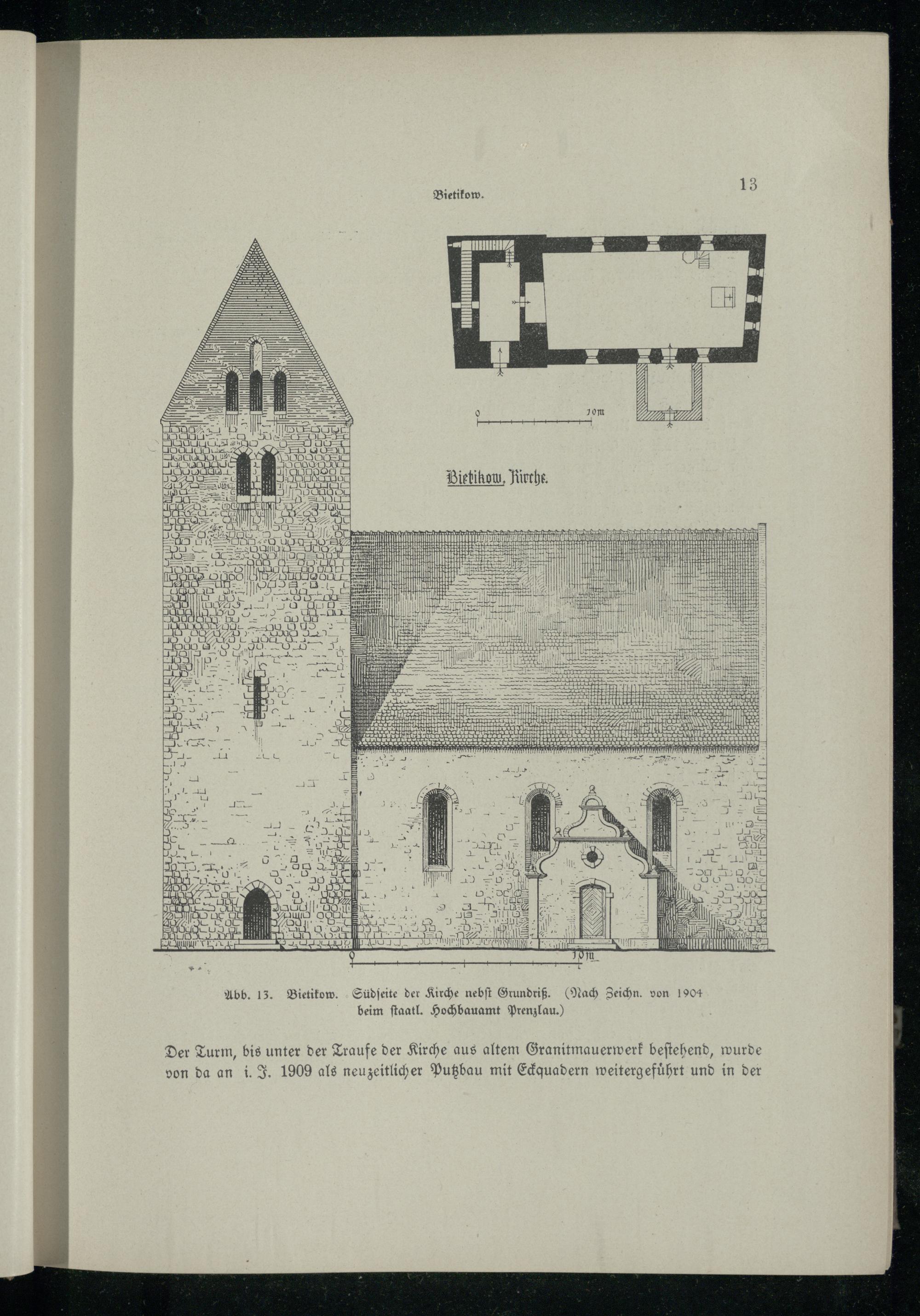 Abb. 13. Bietikow. Südſeite der Kirche nebſt Grundriß. (Nach Zeichn. von 1904 beim ſtaatl. Hochbauamt Prenzlau .)