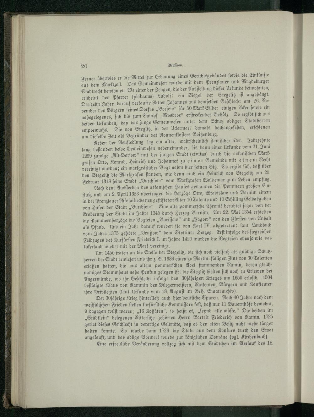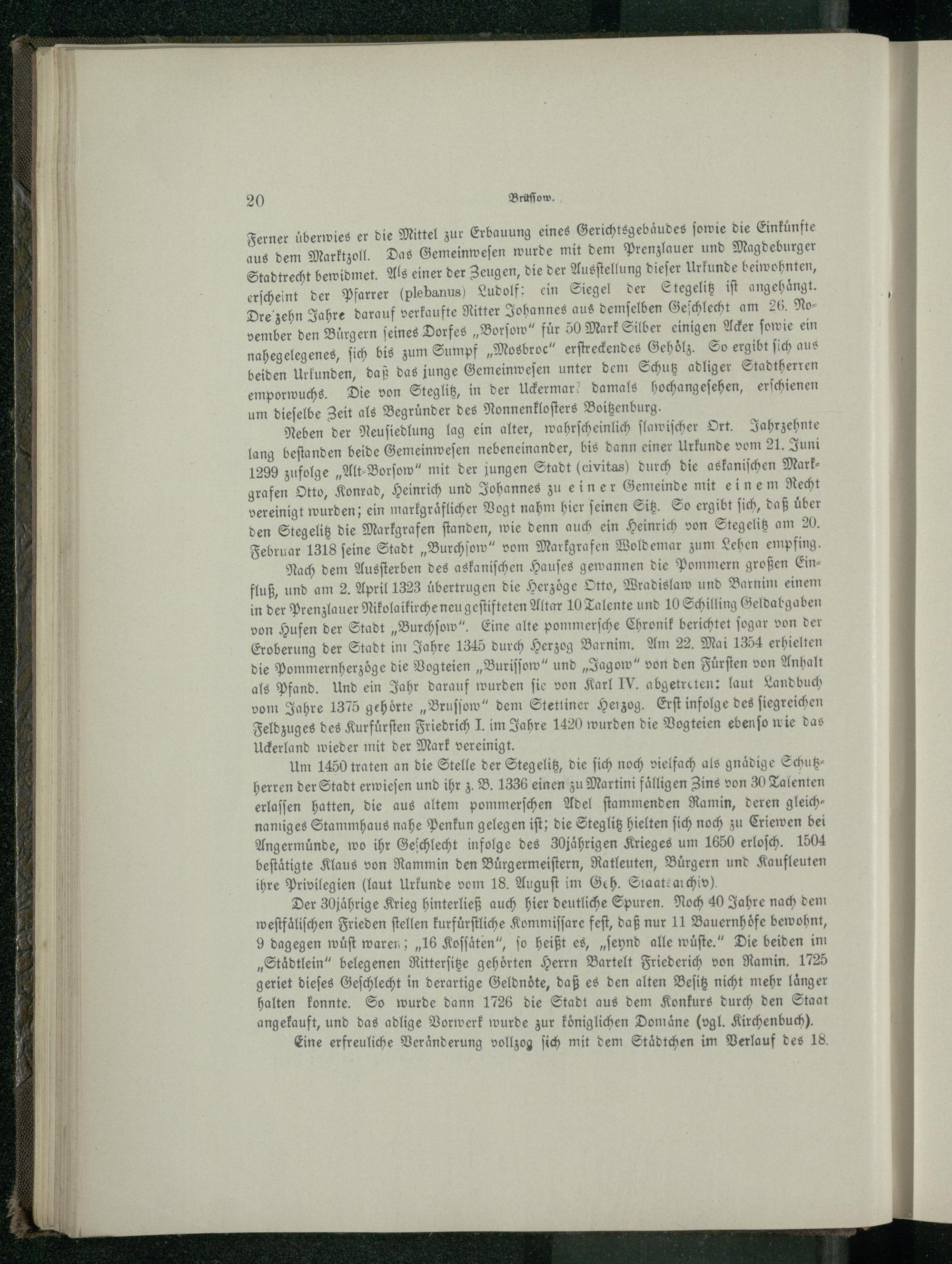 Nach dem Ausſterben des askaniſchen Hauſes gewannen die Pommern großen Einfluß, und am 2. April 1323 übertrugen die Herzöge Otto , Wradislaw und Barnim einem in der Prenzlauer Nikolaikirche neu geſtifteten Altar 10 Talente und 10 Schilling Geldabgaben von Hufen der Stadt„Burchſow“. Eine alte pommerſche Chronik berichtet ſogar von der Eroberung der Stadt im Jahre 1345 durch Herzog Barnim. Am 22. Mai 1354 erhielten die Pommernherzoͤge die Vogteien„Buriſſow“ und„Jagow“ von den Fuͤrſten von Anhalt als Pfand. Und ein Jahr darauf wurden fie von Karl IV. abgetreten: laut Landbuch vom Jahre 1375 gehörte„Bruſſow “ dem Stettiner Herzog. Erſt infolge des ſiegreichen Feldzuges des Kurfuͤrſten Friedrich I. im Jahre 1420 wurden die Vogteien ebenſo wie das Uckerland wieder mit der Mark vereinigt.