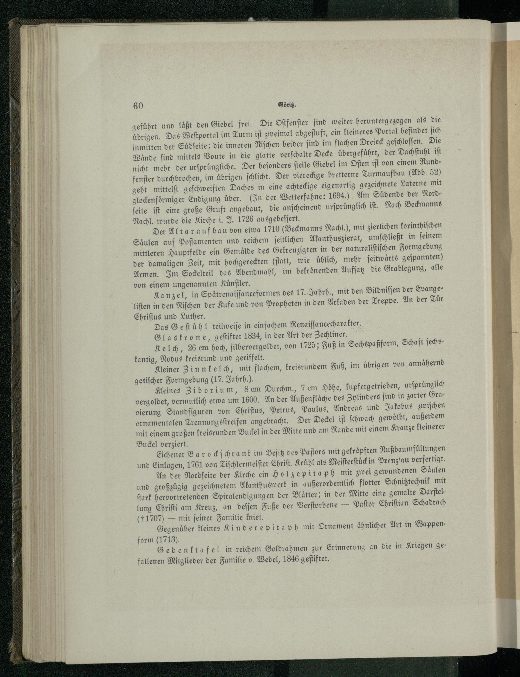 An der Nordſeite der Kirche ein Holzepitaph mit zwei gewundenen Säulen und großzügig gezeichnetem Akanthuswerk in außerordentlich flotter Schnitztechnik mit ſtark hervortretenden Spiralendigungen der Blätter; in der Mitte eine gemalte Darſtellung Chriſti am Kreuz, an deſſen Fuße der Verſtorbene— Paſtor Chriſtian Schadrach (1707— mit feiner Familie kniet.