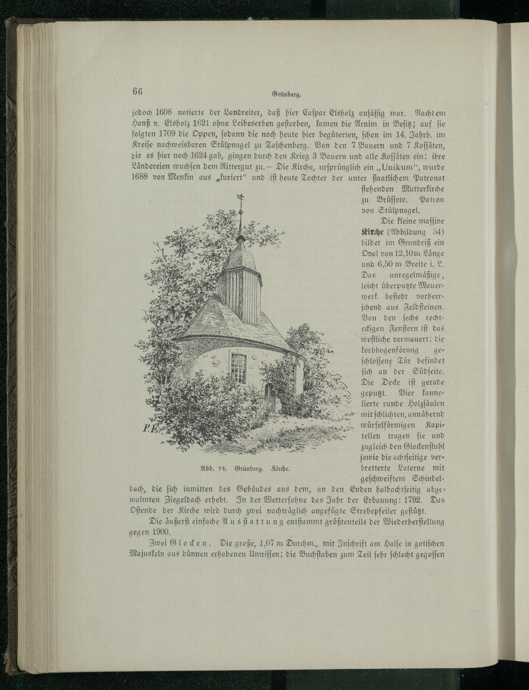 mit ſchlichten, annaͤhernd wuͤrfelfͤrmigen Kapitellen tragen ſie und zugleich den Glockenſtuhl ſowie die achtſeitige verAbb. 54. Grünberg. Kirche. bretterte Laterne mit geſchweiftem Schindeldach, die ſich inmitten des Gebaͤudes aus dem, an den Enden halbachtſeitig abge— walmten Ziegeldach erhebt. In der Wetterfahne das Jahr der Erbauung: 1792. Das Oſtende der Kirche wird durch zwei nachträglich angefuͤgte Strebepfeiler geſtuͤtzt. Die aͤußerſt einfache Austattung entſtammt größtenteils der Wiederherſtellung gegen 1900. Zwei Glocken. Die große, 1,07 m Durchm., mit Inſchrift am Halſe in gotiſchen Maiuskeln aus dünnen erhabenen Umriſſen; die Buchſtaben zum Teil ſehr ſchlecht gegoſſen