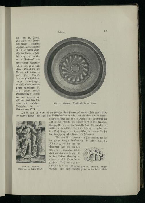 Der Altar(Abb. 56) iſt ein huͤbſches Renaiſſancewerk aus der Zeit gegen 1600, fuͤr welche ſowohl die zierlichen Architekturformen wie auch die nicht gerade hervor—