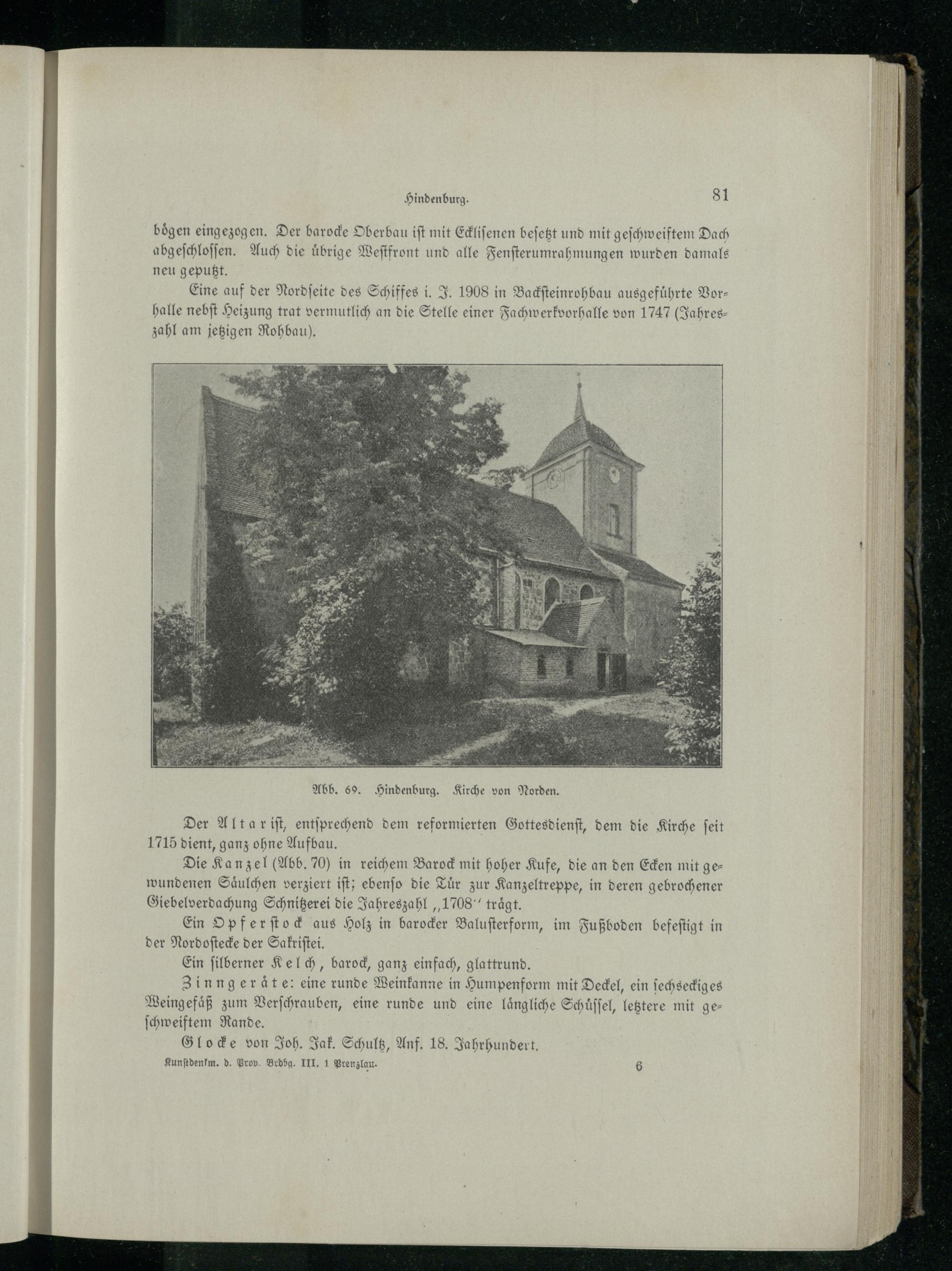 Die Kanzel(Abb. 70) in reichem Barock mit hoher Kufe, die an den Ecken mit gewundenen Saͤulchen verziert iſt; ebenſo die Tuͤr zur Kanzeltreppe, in deren gebrochener Giebelverdachung Schnitzerei die Jahreszahl ‚„1708* trägt.