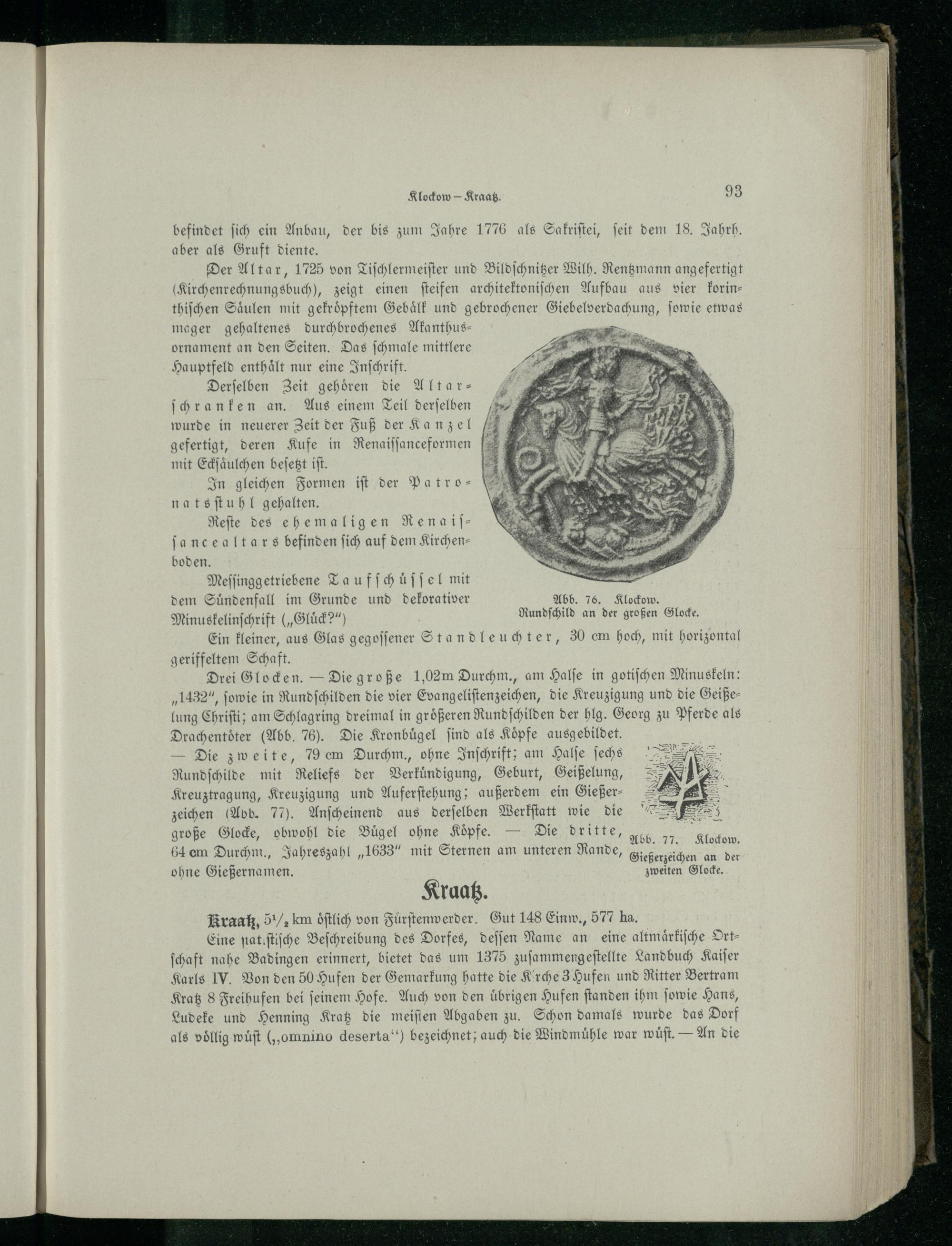 Meſſinggetriebene Tau fſchuſſel mit dem Suͤndenfall im Grunde und dekorativer Abb. 76. Klockow. Minuskelinſchrift( Gluͤck?“ Rundſchild an der großen Glocke.