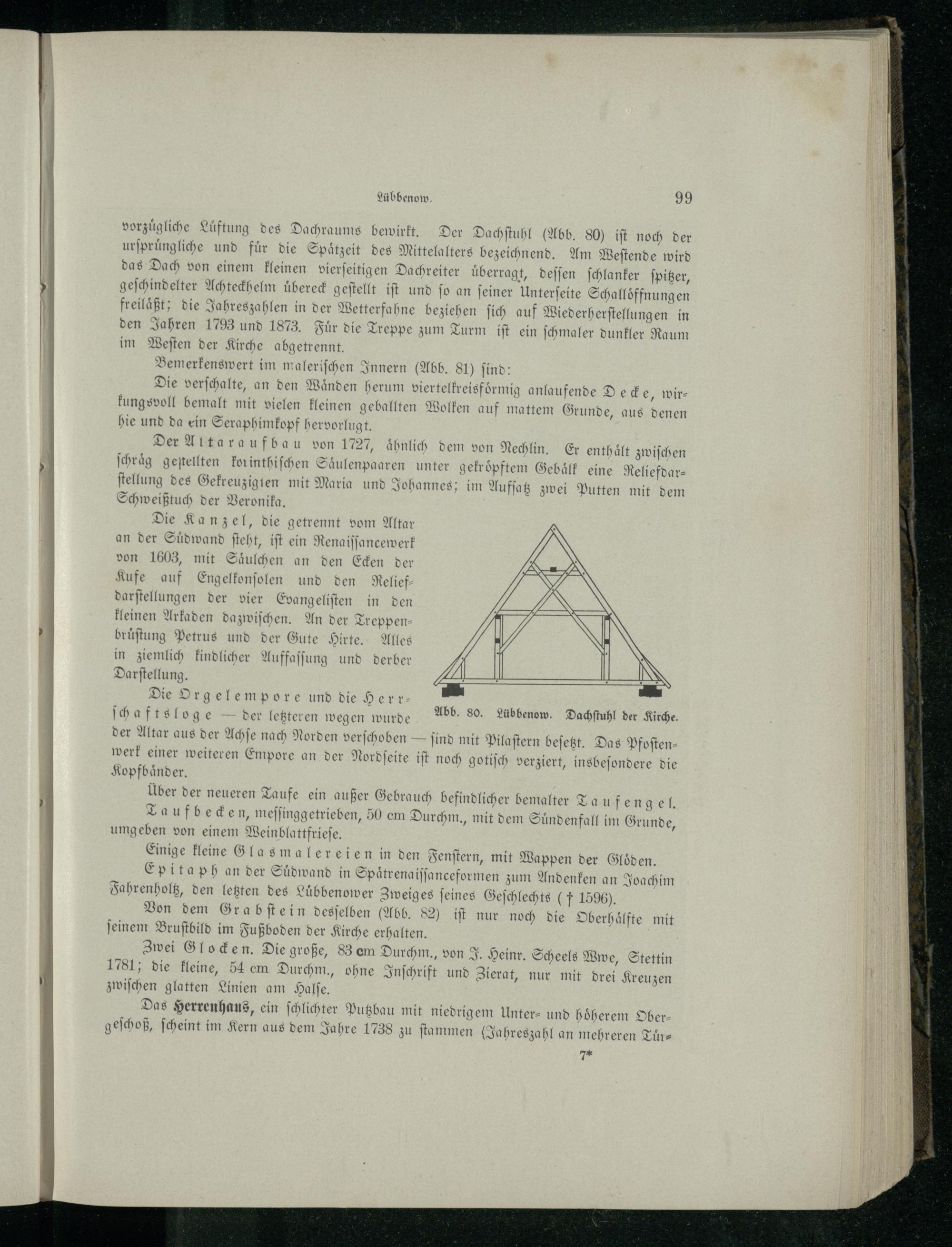 vorzuͤgliche Lüftung des Dachraums bewirkt. Der Dachſtuhl(Abb. 80) iſt noch der urſpruͤngliche und für die Spaͤtzeit des Mittelalters bezeichnend. Am Weſtende wird das Dach von einem kleinen vierſeitigen Dachreiter überragt, deſſen ſchlanker ſpitzer, geſchindelter Achteckhelm uͤbereck geſtellt iſt und ſo an ſeiner Unterſeite Schalloͤffnungen freilaͤßt; die Jahreszahlen in der ö beziehen ſich auf Wiederherſtellungen in den Jahren 1793 und 1873. Fuͤr die T reppe zum Turm iſt ein ſchmaler dunkler Raum im Weſten der Kirche abgetrennt.