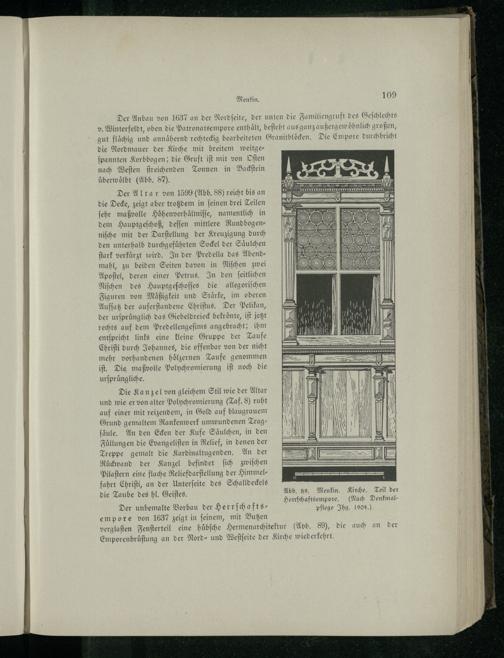 verglaſten Fenſterteil eine huͤbſche Hermenarchitektur(Abb. 89), die auch an der Emporenbruͤſtung an der Nord- und Weſtſeite der Kirche wiederkehrt,