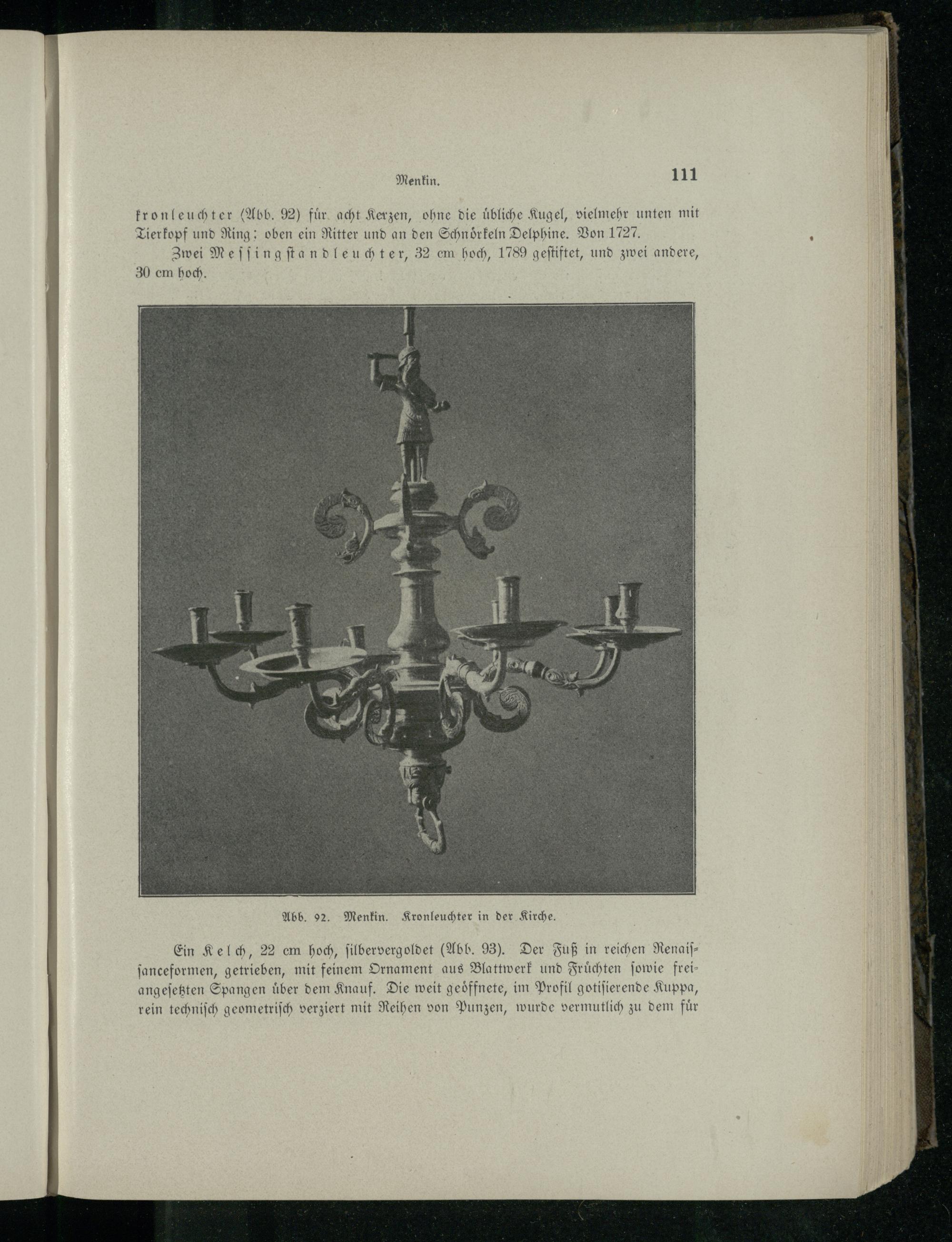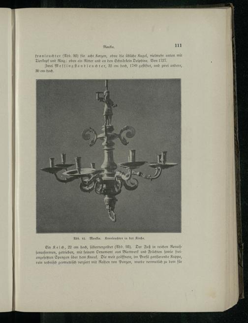 kronleuchter(Abb. 92) für. acht Kerzen, ohne die übliche Kugel, vielmehr unten mit Tierkopf und Ring; oben ein Ritter und an den Schnoͤrkeln Delphine. Von 1727.