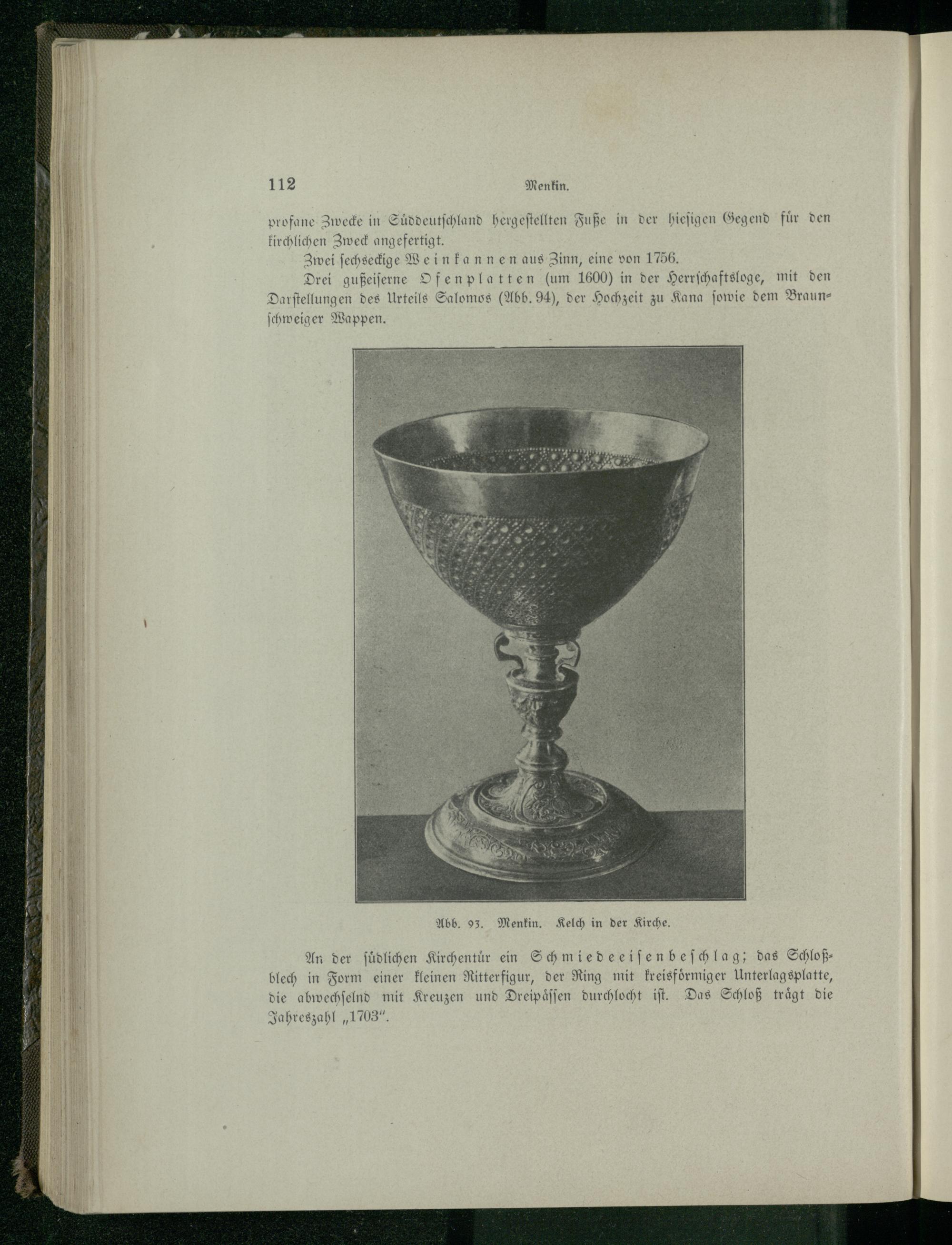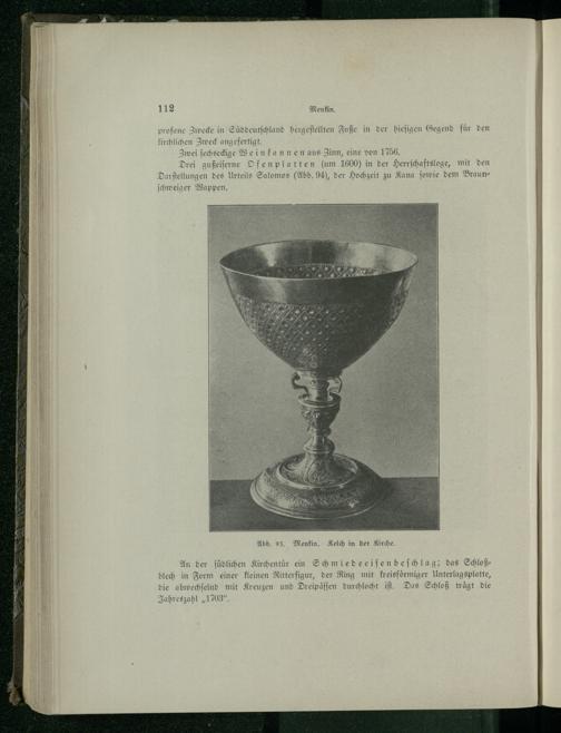 112 Menkin. profane Zwecke in Suͤddeutſchland hergeſtellten Fuße in der hieſigen Gegend für den kirchlichen Zweck angefertigt. Zwei ſechseckige Wein kann en aus Zinn , eine von 1756. Ofenplatten(um 1600) in der Herrſchaftsloge, mit den