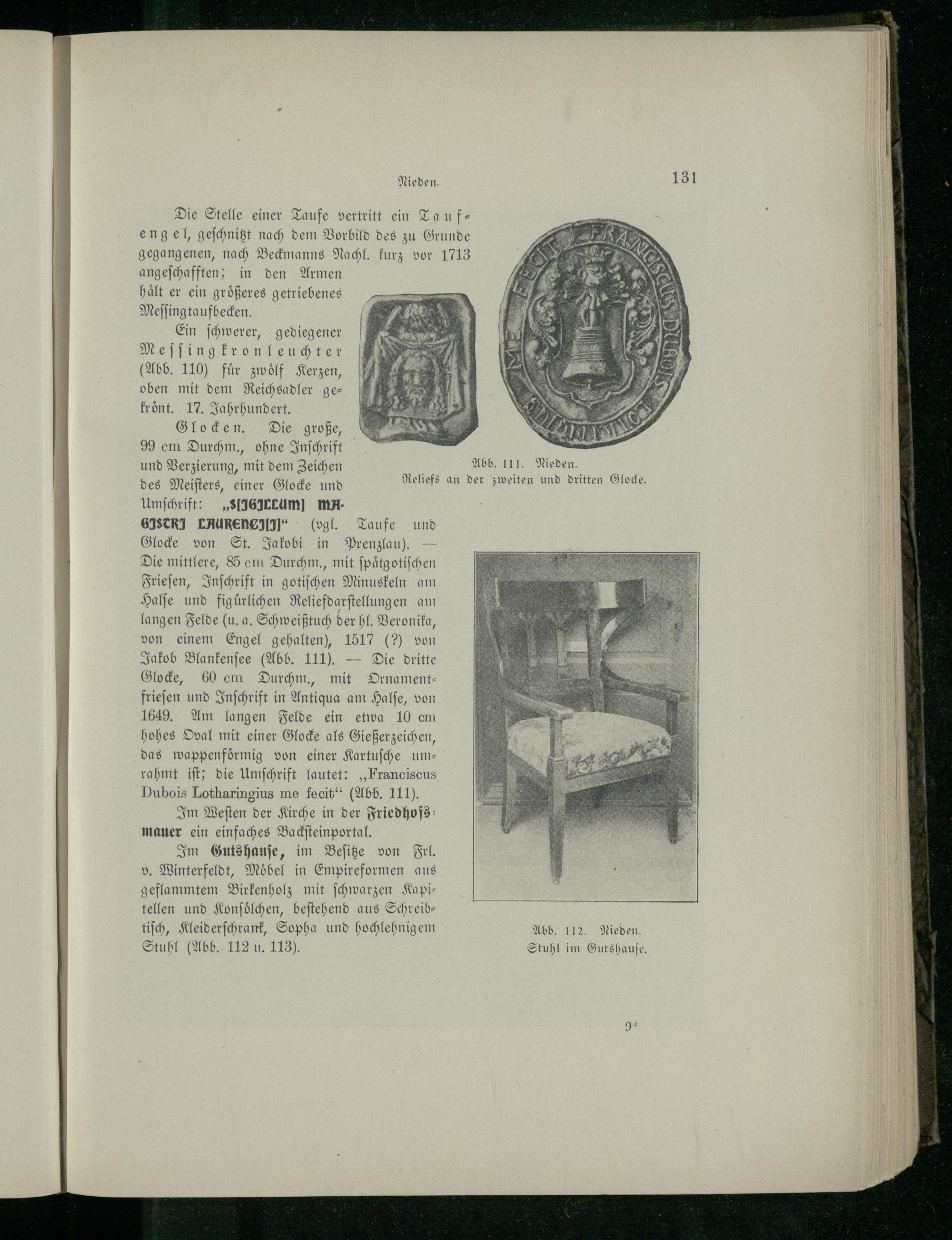 GISTRI LAURENCI[II“(ogl. Taufe und Glocke von St. Jakobi in Prenzlau ). + Die mittlere, 8 cm Durchm., mit ſpaͤtgotiſchen / Frieſen, Inſchrift in gotiſchen Minuskeln am Halſe und figuͤrlichen Reliefdarſtellungen am langen Felde(u. a. Schweißtuch der hl. Veronika, von einem Engel gehalten), 1517(?) von Jakob Blankenſee(Abb. 111).— Die dritte Glocke, 60 em Durchm., mit Ornament— frieſen und Inſchrift in Antiqua am Halſe, von 1649. Am langen Felde ein etwa 10 em . hohes Oval mit einer Glocke als Gießerzeichen, das wappenfoͤrmig von einer Kartuſche um⸗— rahmt iſt; die Umſchrift lautet:„Franciscus Dubois Lotharingius me fecit“(Abb. 111). Im Weſten der Kirche in der Friedhofs: mauer ein einfaches Backſteinportal. Im Gutshauſe, im Beſitze von Frl. v. Winterfeldt, Moͤbel in Empireformen aus geflammtem Birkenholz mit ſchwarzen Kapi— tellen und Konſoͤlchen, beſtehend aus Schreibtiſch, Kleiderſchrank, Sopha und hochlehnigem Abb. 112. Nieden. Stuhl(Abb. 112 u. 113). Stuhl im Gutshauſe.