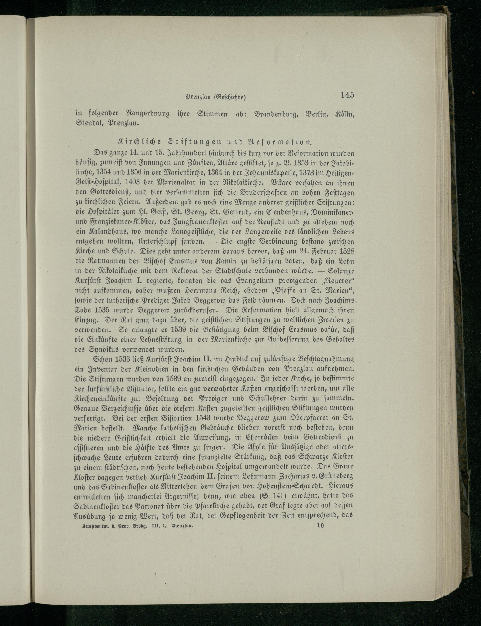 Schon 1536 ließ Kurfuͤrſt Joachim II. im Hinblick auf zukuͤnftige Beſchlagnahmung ein Inventar der Kleinodien in den kirchlichen Gebäuden von Prenzlau aufnehmen. Die Stiftungen wurden von 1539 an zumeiſt eingezogen. In jeder Kirche, ſo beſtimmte der kurfuͤrſtliche Viſitator, ſollte ein gut verwahrter Kaſten angeſchafft werden, um alle Kircheneinkuͤnfte zur Beſoldung der Prediger und Schullehrer darin zu ſammeln. Genaue Verzeichniſſe uͤber die dieſem Kaſten zugeteilten geiſtlichen Stiftungen wurden verfertigt. Bei der erſten Viſitation 1543 wurde Beggerow zum Oberpfarrer an St. Marien beſtellt. Manche katholiſchen Gebraͤuche blieben vorerſt noch beſtehen, denn die niedere Geiſtlichkeit erhielt die Anweiſung, in Chorroͤcken beim Gottesdienſt zu aſſiſtieren und die Hälfte des Amts zu fingen. Die Aſyle für Ausſaͤtzige oder altersſchwache Leute erfuhren dadurch eine finanzielle Staͤrkung, daß das Schwarze Kloſter zu einem ſtaͤdtiſchen, noch heute beſtehenden Hoſpital umgewandelt wurde. Das Graue Kloſter dagegen verlieh Kurfuͤrſt Joachim II. ſeinem Lehnmann Zacharias v. Gruͤneberg und das Sabinenkloſter als Ritterlehen dem Grafen von Hohenſtein⸗Schwedt . Hieraus entwickelten ſich mancherlei Argerniſſe; denn, wie oben(S. 140) erwähnt, hatte das Sabinenkloſter das Patronat über die Pfarrkirche gehabt, der Graf legte aber auf deſſen Ausuͤbung ſo wenig Wert, daß der Rat, der Gepflogenheit der Zeit entſprechend, das