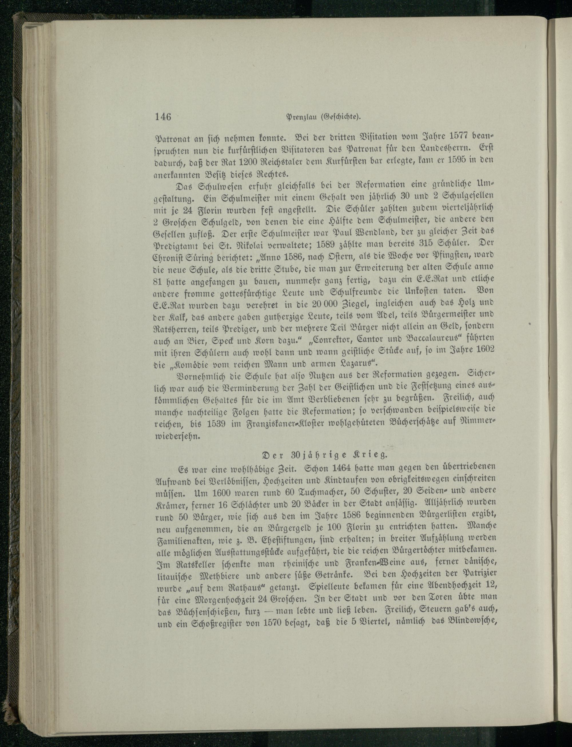 E. E. Rat wurden dazu verehret in die 20 000 Ziegel, ingleichen auch das Holz und der Kalk, das andere gaben gutherzige Leute, teils vom Adel, teils Buͤrgermeiſter und ö Ratsherren, teils Prediger, und der mehrere Teil Buͤrger nicht allein an Geld, ſondern| auch an Bier, Speck und Korn dazu.“„Conrektor , Cantor und Baccalaureus“ führten mit ihren Schuͤlern auch wohl dann und wann geiſtliche Stuͤcke auf, ſo im Jahre 1602 die„Komödie vom reichen Mann und armen Lazarus.