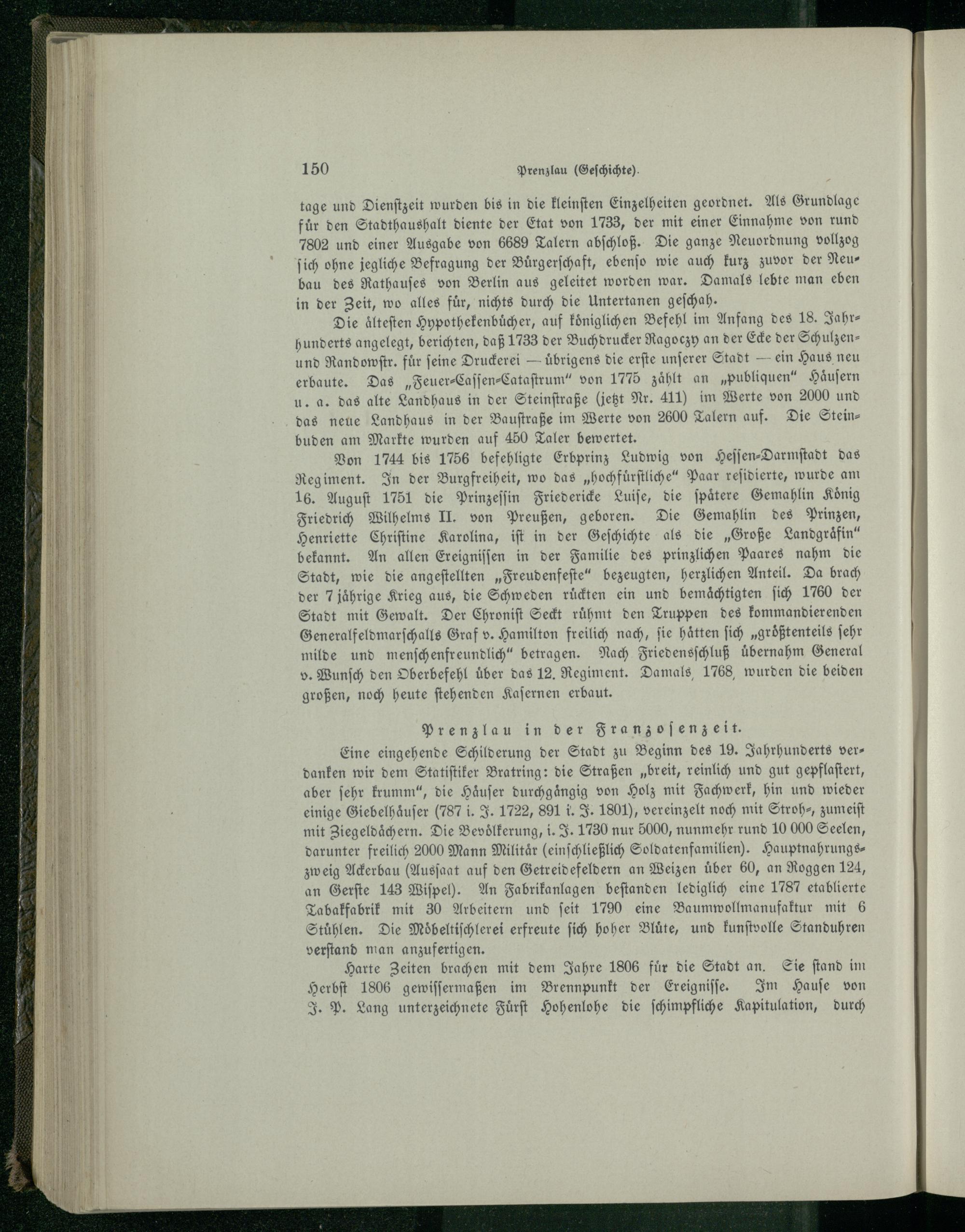Eine eingehende Schilderung der Stadt zu Beginn des 19. Jahrhunderts vers danken wir dem Statiſtiker Bratring: die Straßen„breit, reinlich und gut gepflaſtert, aber ſehr krumm“, die Haͤuſer durchgängig von Holz mit Fachwerk, hin und wieder einige Giebelhaäͤuſer(787 i. J. 1722, 891 i. J. 1801), vereinzelt noch mit Stroh- zumeiſt mit Ziegeldaͤchern. Die Bevoͤlkerung, i. J. 1730 nur 5000, nunmehr rund 10 000 Seelen, darunter freilich 2000 Mann Militär(einſchließlich Soldatenfamilien). Hauptnahrungs—zweig Ackerbau(Ausſaat auf den Getreidefeldern an Weizen über 60, an Roggen 124, an Gerſte 143 Wiſpeh. An Fabrikanlagen beſtanden lediglich eine 1787 etablierte Tabakfabrik mit 30 Arbeitern und ſeit 1790 eine Baumwollmanufaktur mit 6 Stühlen. Die Moͤbeltiſchlerei erfreute ſich hoher Blüte, und kunſtvolle Standuhren verſtand man anzufertigen.