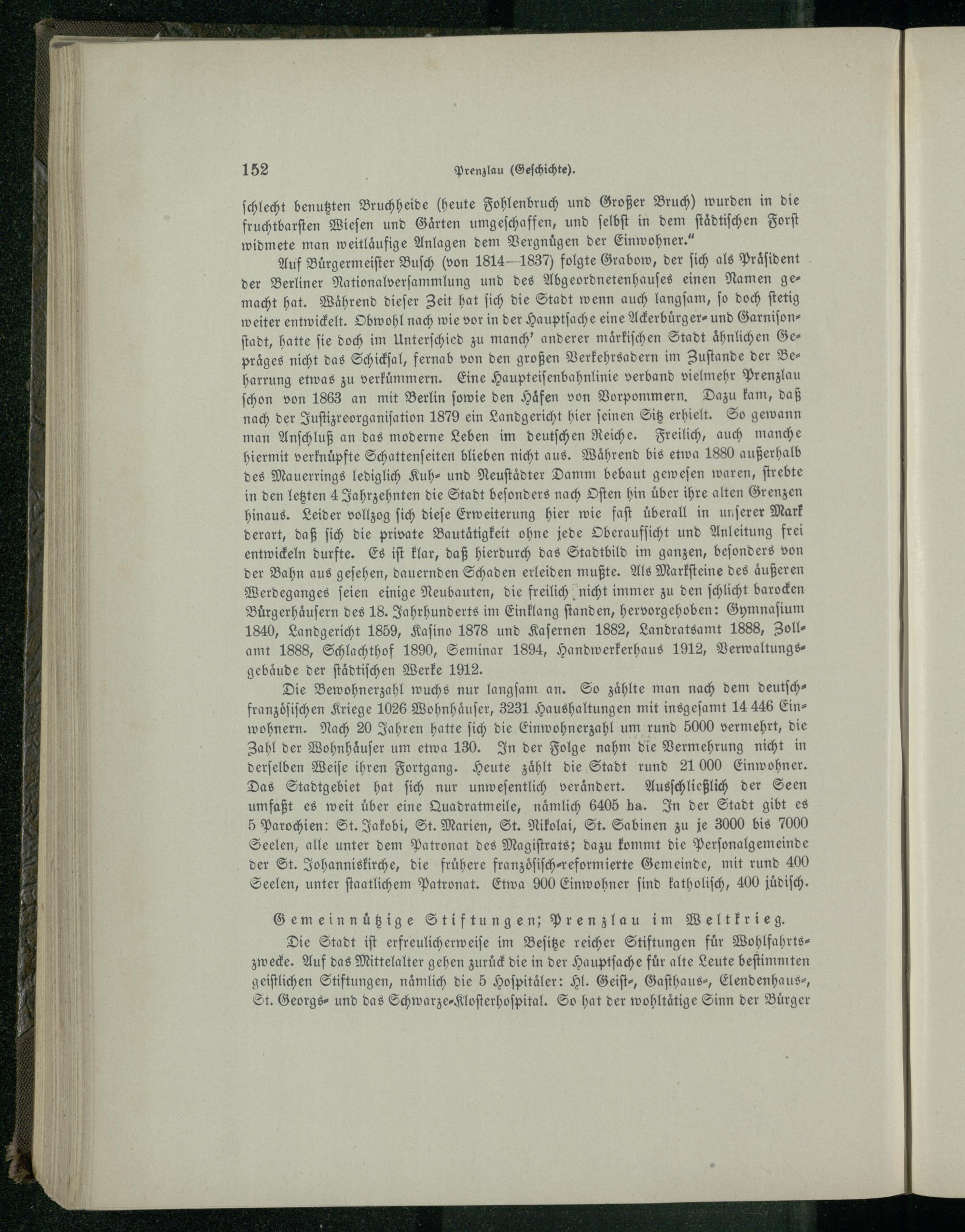 Gemeinnützige Stiftungen; Prenzlau im Weltkrieg. Die Stadt iſt erfreulicherweiſe im Beſitze reicher Stiftungen für Wohlfahrts— zwecke. Auf das Mittelalter gehen zurück die in der Hauptſache für alte Leute beſtimmten geiſtlichen Stiftungen, naͤmlich die 5 Hoſpitaͤler: Hl. Geiſt⸗ , Gaſthaus⸗, Elendenhaus⸗, St. Georgs und das Schwarze⸗Kloſterhoſpital. So hat der wohltaͤtige Sinn der Bürger
