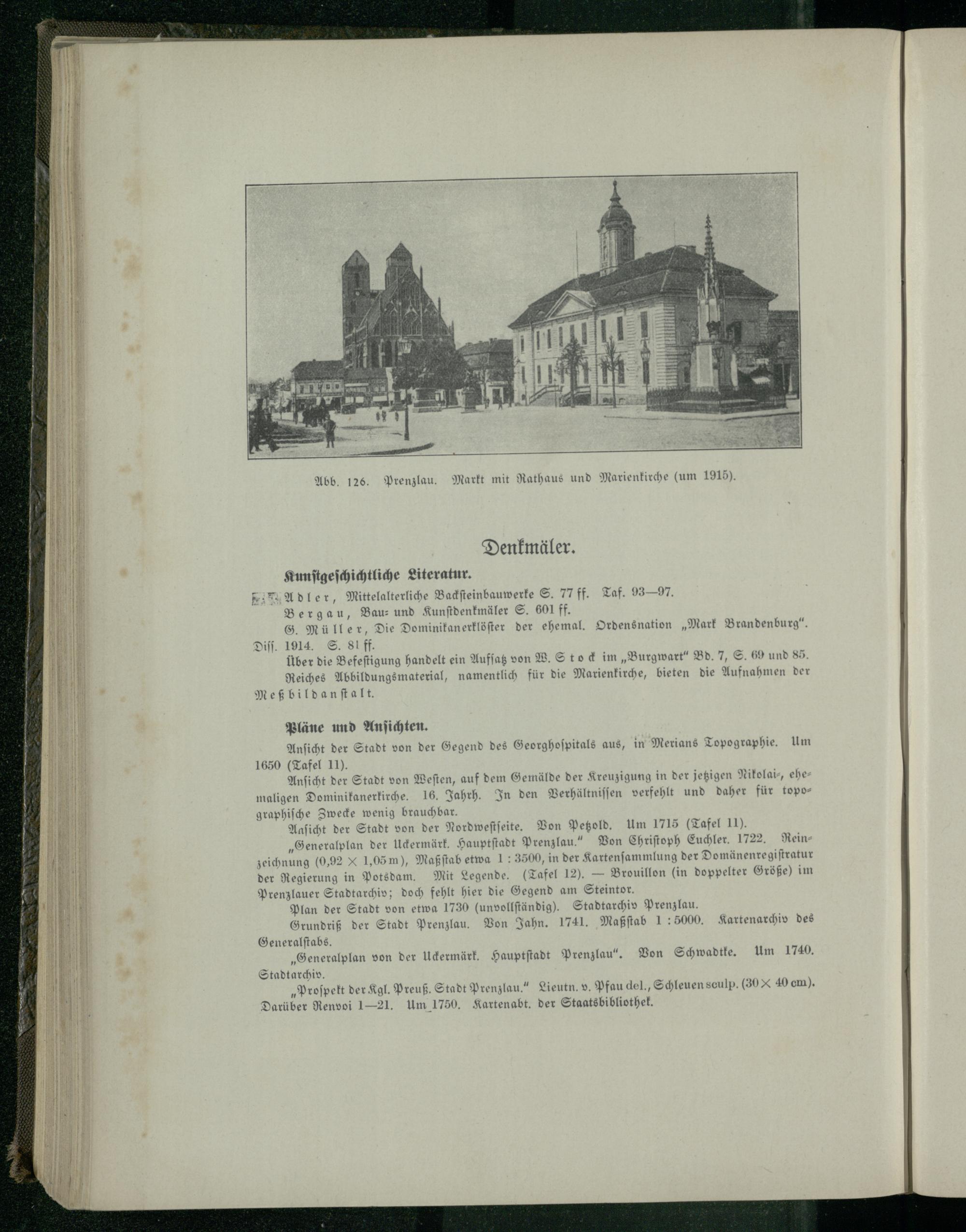 Kunſtgeſchichtliche Literatur. Adler, Mittelalterliche Backſteinbauwerke S. 77 ff. Taf. 93— 97. Berg au, Bau⸗ und Kunſtdenkmäler S. 601 ff. G. Müller, Die Dominikanerklöſter der ehemal. Ordensnation„Mark Brandenburg“. Diff. 1914. S. 81 ff. Über die Befeſtigung handelt ein Aufſatz von W. Stock im„Burgwart“ Bd. 7, S. 69 und 85. Reiches Abbildungsmaterial, namentlich für die Marienkirche, bieten die Aufnahmen der Meßbildanſtalt.