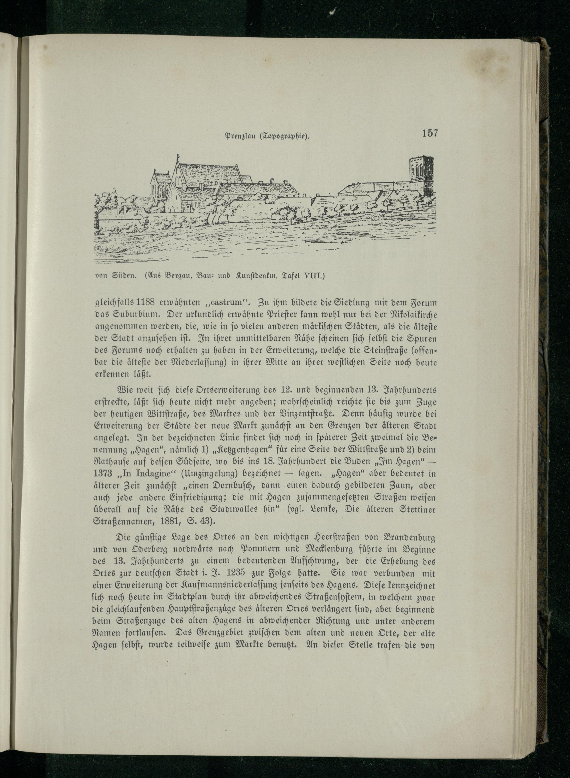 Wie weit ſich dieſe Ortserweiterung des 12. und beginnenden 13. Jahrhunderts erſtreckte, laͤßt ſich heute nicht mehr angeben; wahrſcheinlich reichte fie bis zum Zuge der heutigen Wittſtraße, des Marktes und der Vinzentſtraße. Denn haͤufig wurde bei Erweiterung der Staͤdte der neue Markt zunaͤchſt an den Grenzen der aͤlteren Stadt angelegt. In der bezeichneten Linie findet ſich noch in ſpaͤterer Zeit zweimal die Ber nennung„Hagen “, nämlich 1)„Ketzgenhagen“ für eine Seite der Wittſtraße und 2) beim Rathauſe auf deſſen Suͤdſeite, wo bis ins 18. Jahrhundert die Buden„Im Hagen “— 1373„In Indagine“(Umzingelung) bezeichnet— lagen.„Hagen “ aber bedeutet in älterer Zeit zunaͤchſt„einen Dornbuſch, dann einen dadurch gebildeten Zaun, aber auch jede andere Einfriedigung; die mit Hagen zuſammengeſetzten Straßen weiſen überall auf die Nähe des Stadtwalles hin“(vgl. Lemke, Die älteren Stettiner Straßennamen, 1881, S. 43).