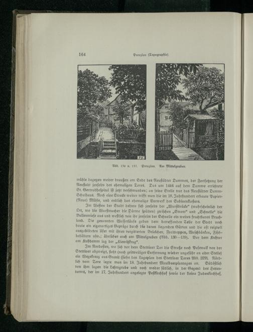 Im Weſten der Stadt dehnte ſich jenſeits der„Wurſtbruͤcke“(wahrſcheinlich der Ort, wo die Wurſtmacher die Daͤrme ſpuͤlten) zwiſchen„Strom“ und„Schnelle“ die Bullenwieſe aus und weſtlich von ihr jenſeits der Schnelle ein weites fruchtbares Bruchland. Die genannten Waſſerlaͤufe geben dem betreffenden Teile der Stadt noch heute ein eigenartiges Gepraͤge durch die daran liegenden Gaͤrten und die oft reizvoll ausgebildeten Ufer mit ihren vergitterten Bruͤckchen, Freitreppen, Waſchbaͤnken, Fiſchbehaͤltern uſw.; aͤhnliches auch am Mittelgraben(Abb. 130 439). Vor dem Kuhtor am Kuhdamm lag der„Kiewitzkrug“.