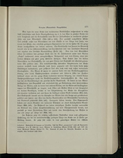 Man legte die neue Kirche den veränderten Beduͤrfniſſen entſprechend in moͤg— lichſt einheitlicher und freier Raumgeſtaltung an, d. h. den Chor in gleicher Breite mit dem Langhauſe und die Seitenſchiffe nach Art der Hallenkirchen in annaͤhernd gleicher Höhe mit dem Mittelſchiff(Abb. 143 u. 144). Der zunaͤchſt ausgeführte oͤſtliche Teil umfaßt außer den Altarniſchen der drei Schiffe in der Laͤnge drei Joche, von denen das oͤſtliche eine erheblich geringere Spannweite hat als die ſpaͤter fuͤr die ganze Kirche durchgefuͤhrte der beiden anderen. Die Verhaͤltniſſe des Innern im Grundriß ſowohl wie in der Hoͤhenentwicklung des Querſchnittes find von tadelloſem Ebenmaß und ergeben eine herrliche Raumwirkung Tafel 14. Von den drei Chorniſchen bildet die mittlere von geringer Tiefe(die im 16. Jahrhundert unter dem Namen „Bucht“ vorkommt) einen unregelmäßigen Polygonteil aus drei Seiten, einer ſehr breiten oͤſtlichen und zwei ganz ſchmalen ſchraͤgen. Noch flacher find die beiden Altarniſchen der Seitenſchiffe, die aus zwei Seiten des Sechsecks mit oſtwaͤrts gew endeter Ecke gebildet find. Die verhältnismäßig ſchwachen Laͤngsmauern der Kirche werden verſtaͤrkt durch teilweiſe nach innen gezogene und hier durch breite ſpitze Schildbogen verbundene, zum groͤßeren Teil aber doch noch nach außen vortretende Strebepfeiler. Die Mauer iſt innen im unteren Teile mit den Verſtaͤrkungspfeilern bündig, aber durch Spitzbogenniſchen erleichtert und bildet in Höhe der Fenſterſohlbank einen um die ganze Kirche laufenden inneren Umgang, der mittels kleiner Spitzbogenoͤffnungen durch die Verſtaͤrkungspfeiler hindurchgefuͤhrt iſt. Vor dieſe legt ſich als Gewoͤlbetraͤger ein ziemlich ſtarker Runddienſt. Er findet an den Mittel— ſchiffspfeilern ſein Gegenſtuͤck und wiederholt ſich, zur Vollendung einer ſymmetriſchen Anlage der Pfeiler, auch an deren drei anderen Seiten, um die Gurt⸗ und die Diagonalrippen des Mittelſchiffs zu tragen; nach Oſten und Weſten bildet er das Hauptglied der breiten Gurtboͤgen, welche in der Laͤngsrichtung der Kirche die Kreuzpfeiler mit einander verbinden und aus ihnen ihr kraͤftiges reiches Profil herleiten(Abb. 142). Das Sockelprofil ſowohl wie die Kaͤmpfer der Pfeiler ſind ſehr knapp und zuruͤckhaltend gebildet und letztere nur über den ſtarken Runddienſten des Mittelſchiffes kapitellartig mit Blattwerk geſchmuͤckt(Abb. 142). Quergurte fehlen bereits. Das Rippenprofil beſteht aus einem Birnſtab mit vorderem Plaͤttchen an einem ſteilabgefaſten Grund— koͤrper(Abb. 142). Im Maßwerk der hohen vierteiligen Fenſter herrſcht namentlich ein Entwurf vor, deſſen Hauptlinienfuͤhrung auf dem Schuppenmotiv beruht, das zunaͤchſt zu einer Zweiteilung fuͤhrt und damit eine Unterſcheidung der Pfoſten in alte und junge zur Folge hat(Abb. 142).