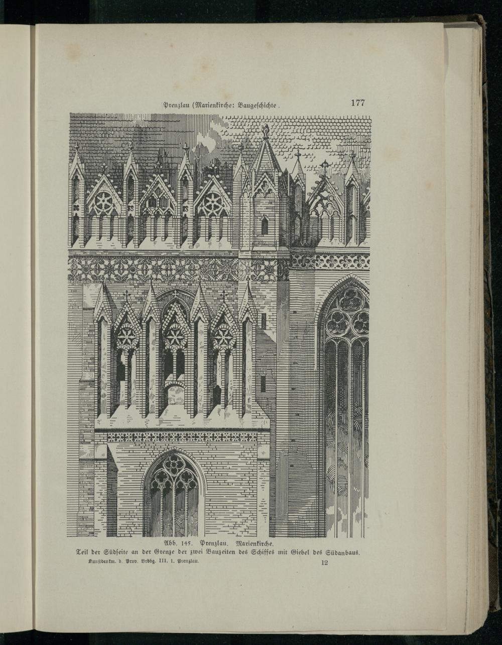 Abb. 145. Prenzlau. Marienkirche.Teil der Südſeite an der Grenze der zwei Bauzeiten des Schiffes mit Giebel des Südanbaus.Kunſtden km. d. Prov. Brdbg. III. 1. Prenzlau. 12
