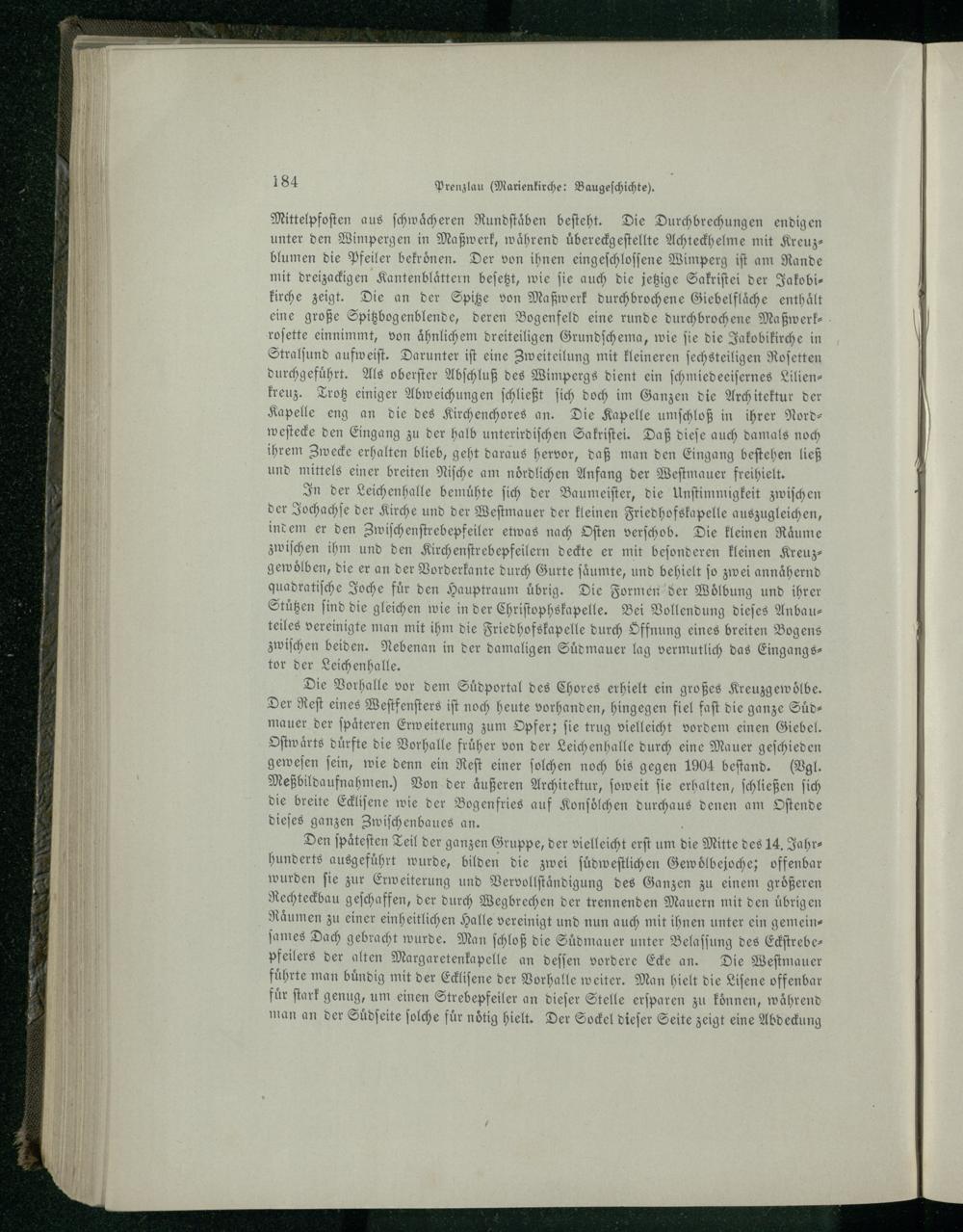 Mittelpfoſten aus ſchwaͤcheren Rundſtaͤben beſteht. Die Durchbrechungen endigen unter den Wimpergen in Maßwerk, waͤhrend uͤbereckgeſtellte Achteckhelme mit Kreuzblumen die Pfeiler bekroͤnen. Der von ihnen eingeſchloſſene Wimperg iſt am Rande mit dreizackigen Kantenblaͤttern beſetzt, wie fie auch die jetzige Sakriſtei der Jakobikirche zeigt. Die an der Spitze von Maßwerk durchbrochene Giebelflaͤche enthält eine große Spitzbog enblende, deren Bogenfeld eine runde durchbrochene Maßwerk— roſette einnimmt, von aͤhnlichem dreiteiligen Grundſchema, wie ſie die Jakobikirche in Stralſund aufweiſt. Darunter iſt eine Zweiteilung mit kleineren ſechsteiligen Roſetten durchgeführt. Als oberſter Abſchluß des Wimpergs dient ein ſchmiedeeiſernes Lilien— kreuz. Trotz einiger Abweichungen ſchließt ſich doch im Ganzen die Architektur der Kapelle eng an die des Kirchenchores an. Die Kapelle umſchloß in ihrer Nord— weſtecke den Eingang zu der halb unterirdiſchen Sakriſtei. Daß dieſe auch damals noch ihrem Zwecke erhalten blieb, geht daraus hervor, daß man den Eingang beſtehen ließ und mittels einer breiten Niſche am noͤrdlichen Anfang der Weſtmauer freihielt