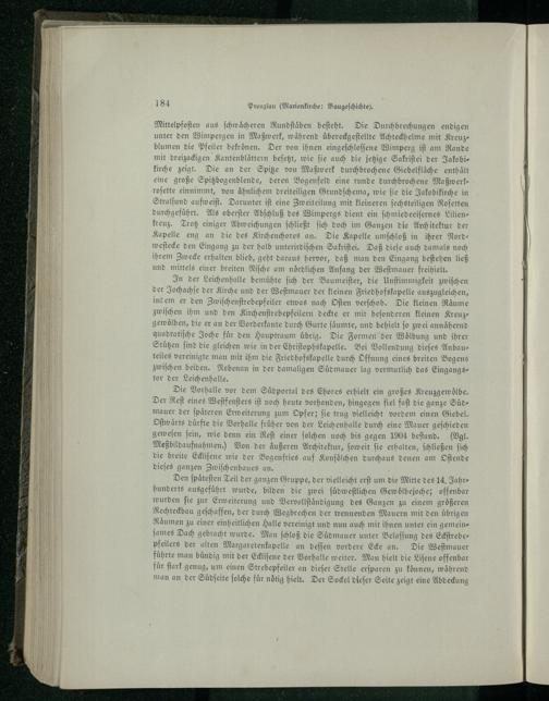 Die Vorhalle vor dem Suͤdportal des Chores erhielt ein großes Kreuzgewoͤlbe. Der Reſt eines Weſtfenſters iſt noch heute vorhanden, hingegen fiel faſt die ganze Suͤdmauer der ſpaͤteren Erweiterung zum Opfer; ſie trug vielleicht vordem einen Giebel. Oſtwaͤrts dürfte die Vorhalle früher von der Leichenhalle durch eine Mauer geſchieden geweſen ſein, wie denn ein Reſt einer ſolchen noch bis gegen 1904 beſtand.(gl. Meßbildaufnahmen) Von der aͤußeren Architektur, ſoweit ſie erhalten, ſchließen ſich die breite Eckliſene wie der Bogenfries auf Konſoͤlchen durchaus denen am Oſtende dieſes ganzen Zwiſchenbaues an.