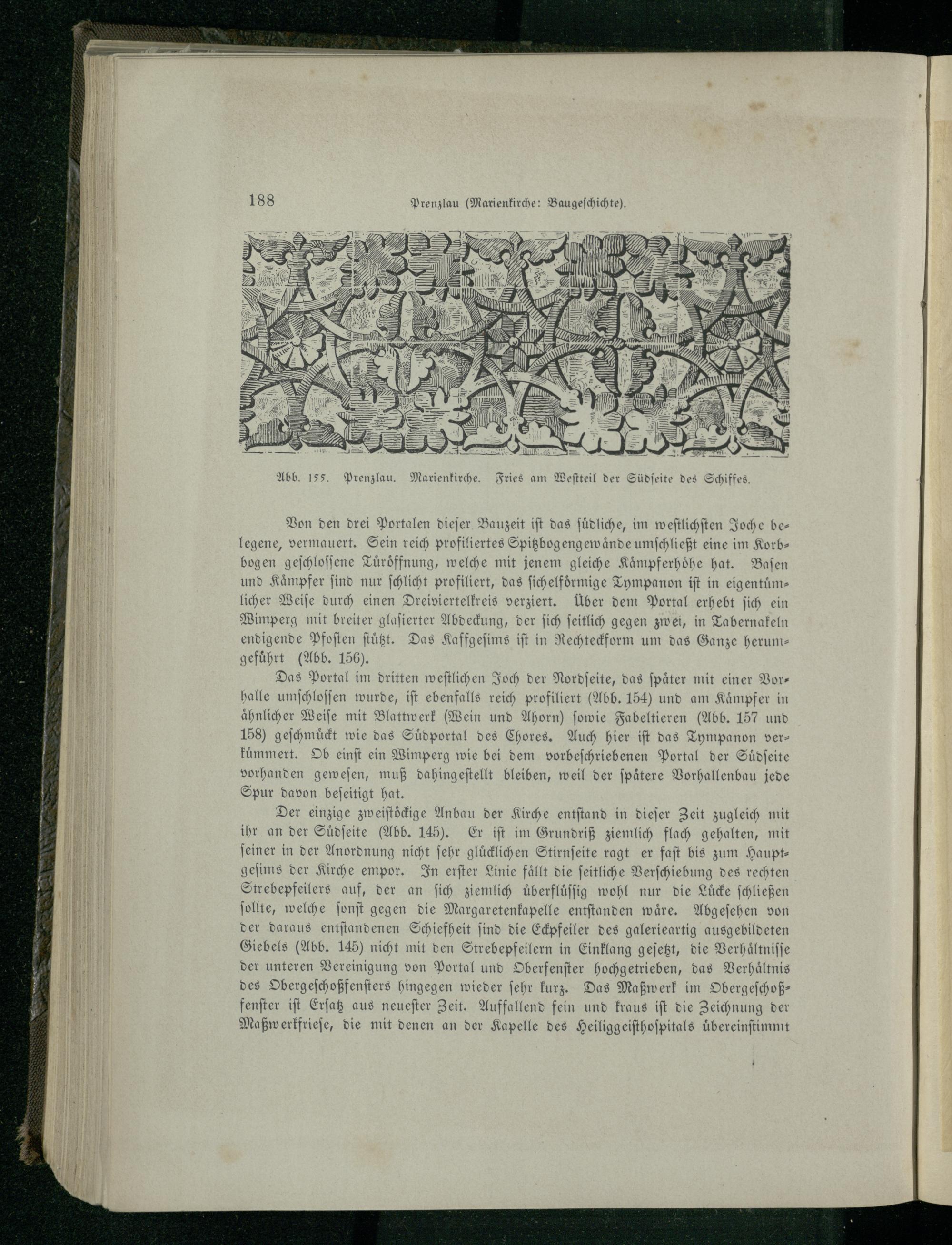 Der einzige zweiſtoͤckige Anbau der Kirche entſtand in dieſer Zeit zugleich mit ihr an der Suͤdſeite(Abb. 145). Er iſt im Grundriß ziemlich flach gehalten, mit ſeiner in der Anordnung nicht ſehr gluͤcklichen Stirnſeite ragt er faſt bis zum Haupt— geſims der Kirche empor. In erſter Linie fällt die ſeitliche Verſchiebung des rechten Strebepfeilers auf, der an ſich ziemlich uͤberfluͤſſig wohl nur die Luͤcke ſchließen ſollte, welche ſonſt gegen die Margaretenkapelle entſtanden waͤre. Abgeſehen von der daraus entſtandenen Schiefheit ſind die Eckpfeiler des galerieartig ausgebildeten Giebels(Abb. 145) nicht mit den Strebepfeilern in Einklang geſetzt, die Verhaͤltniſſe der unteren Vereinigung von Portal und Oberfenſter hochgetrieben, das Verhaͤltnis des Obergeſchoßfenſters hingegen wieder ſehr kurz. Das Maßwerk im Obergeſchoßfenſter iſt Erſatz aus neueſter Zeit. Auffallend fein und kraus iſt die Zeichnung der Maßwerkfrieſe, die mit denen an der Kapelle des Heiliggeiſthoſpitals uͤbereinſtimmt