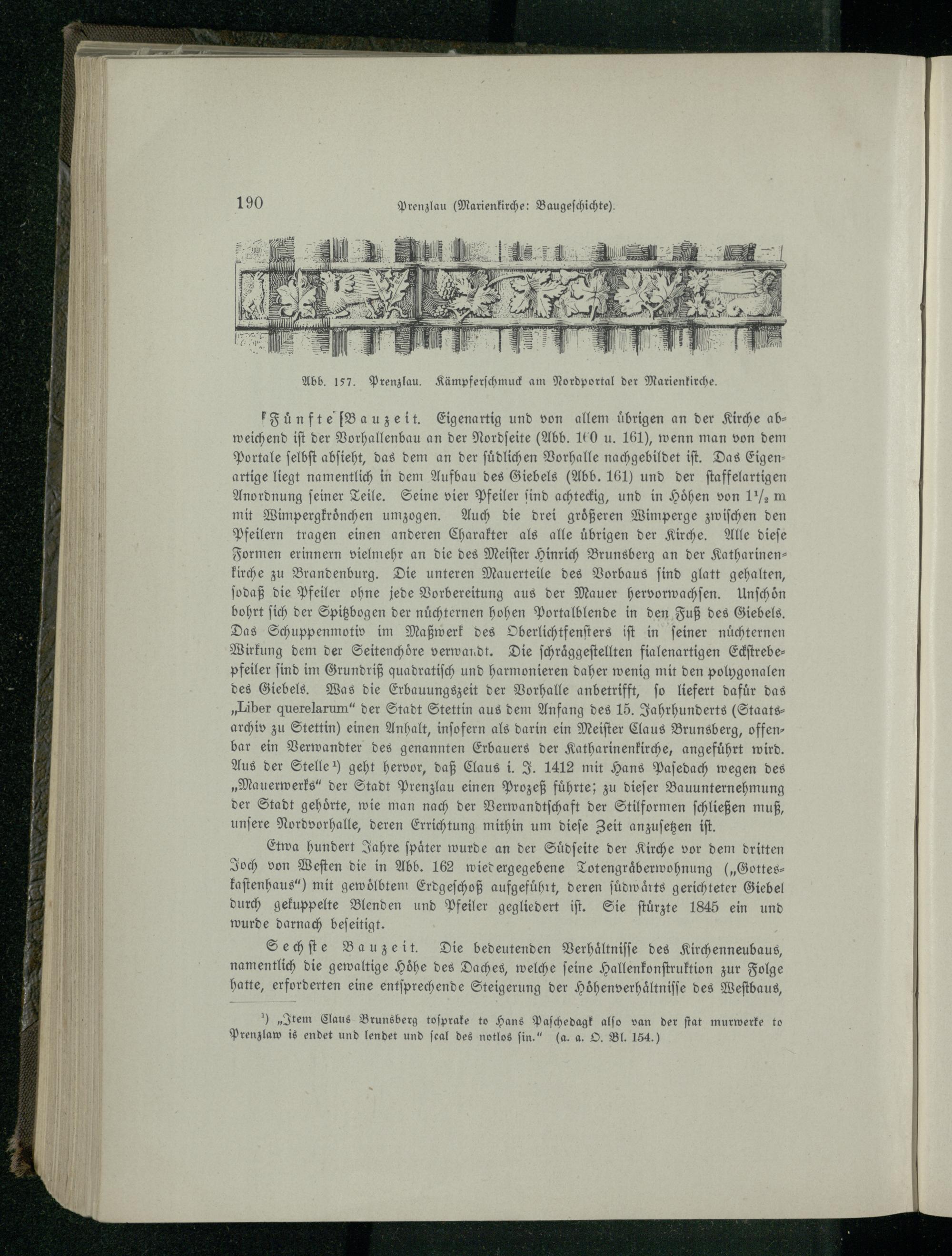 Fünfte ſBauzeit. Eigenartig und von allem übrigen an der Kirche abweichend iſt der Vorhallenbau an der Nordſeite(Abb. 160 u. 161), wenn man von dem Portale ſelbſt abſieht, das dem an der ſuͤdlichen Vorhalle nachgebildet iſt. Das Eigen artige liegt namentlich in dem Aufbau des Giebels(Abb. 161) und der ſtaffelartigen Anordnung feiner Teile. Seine vier Pfeiler ſind achteckig, und in Höhen von 11½ m mit Wimpergkroͤnchen umzogen. Auch die drei größeren Wimperge zwiſchen den Pfeilern tragen einen anderen Charakter als alle übrigen der Kirche. Alle dieſe Formen erinnern vielmehr an die des Meiſter Hinrich Brunsberg an der Katharinenkirche zu Brandenburg . Die unteren Mauerteile des Vorbaus ſind glatt gehalten, ſodaß die Pfeiler ohne jede Vorbereitung aus der Mauer hervorwachſen. Unſchoͤn bohrt ſich der Spitzbogen der nuͤchternen hohen Portalblende in den Fuß des Giebels. Das Schuppenmotio im Maßwerk des Oberlichtfenſters iſt in feiner nüchternen Wirkung dem der Seitenchoͤre verwandt. Die ſchraͤggeſtellten fialenartigen Eckſtrebepfeiler ſind im Grundriß quadratiſch und harmonieren daher wenig mit den polygonalen des Giebels . Was die Erbauungszeit der Vorhalle anbetrifft, fo liefert dafür das „Liber querelarum“ der Stadt Stettin aus dem Anfang des 15. Jahrhunderts(Staats— archiv zu Stettin ) einen Anhalt, inſofern als darin ein Meiſter Claus Brunsberg, offen= bar ein Verwandter des genannten Erbauers der Katharinenkirche, angefuͤhrt wird. Aus der Stelle) geht hervor, daß Claus i. J. 1412 mit Hans Paſedach wegen des „Mauerwerks“ der Stadt Prenzlau einen Prozeß führte; zu dieſer Bauunternehmung der Stadt gehoͤrte, wie man nach der Verwandtſchaft der Stilformen ſchließen muß, unſere Nordvorhalle, deren Errichtung mithin um dieſe Zeit anzuſetzen iſt.