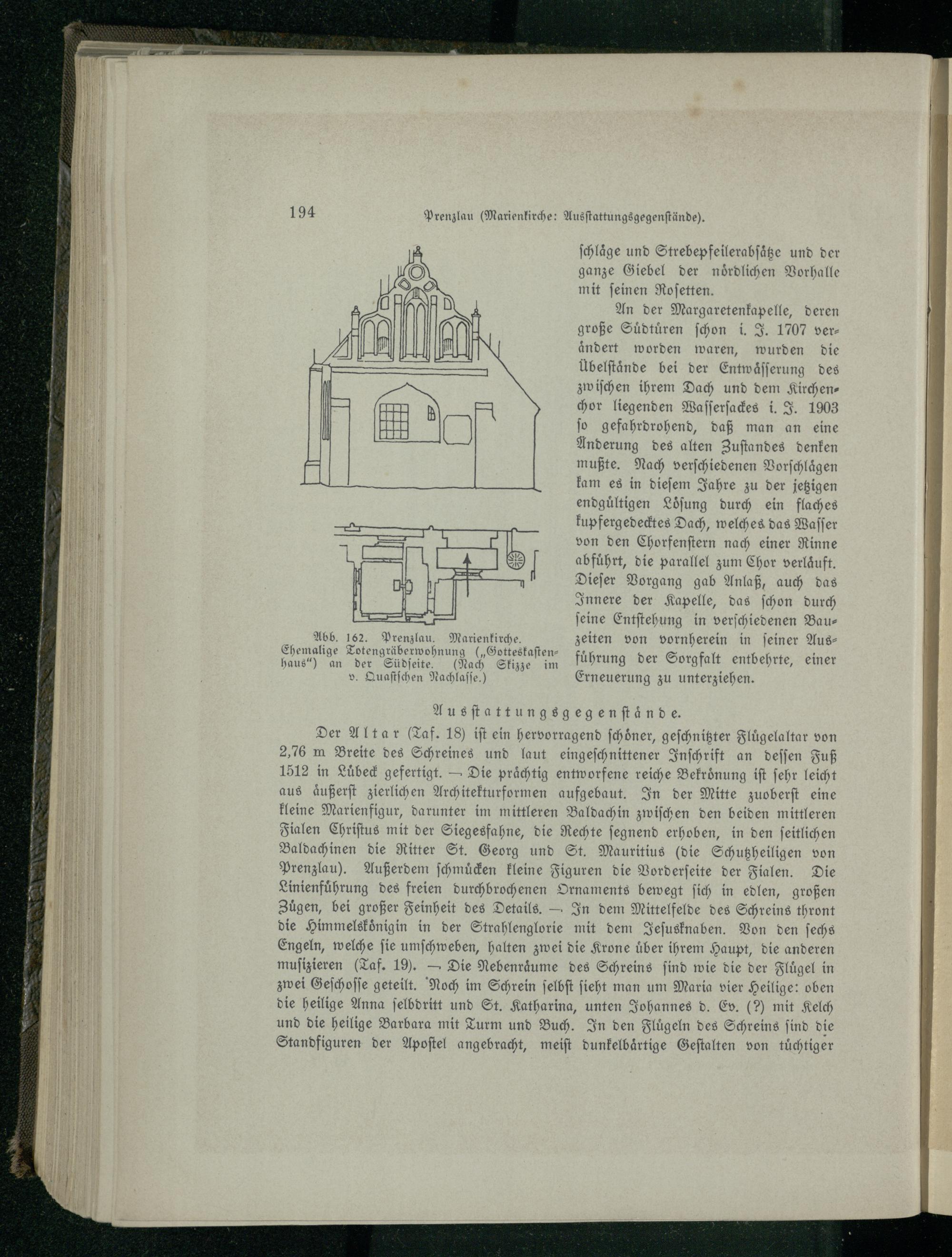 An der Margaretenkapelle, deren große Suͤdtuͤren ſchon i. J. 1707 veraͤndert worden waren, wurden die Übelſtaͤnde bei der Entwaͤſſerung des zwiſchen ihrem Dach und dem Kirchen chor liegenden Waſſerſackes i. J. 1903 ſo gefahrdrohend, daß man an eine Anderung des alten Zuſtandes denken mußte. Nach verſchiedenen Vorſchlaͤgen kam es in dieſem Jahre zu der jetzigen endguͤltigen Loͤſung durch ein flaches kupfergedecktes Dach, welches das Waſſer von den Chorfenſtern nach einer Rinne abfuͤhrt, die parallel zum Chor verlaͤuft. Dieſer Vorgang gab Anlaß, auch das Innere der Kapelle, das ſchon durch ſeine Entſtehung in verſchiedenen Bau— Abb. 162. Prenzlau . Marienkirche. zeiten von vornherein in feiner YusEhemalige Totengräberwohnung(„Gotteskaſten⸗ fuͤhrung der Sorgfalt entbehrte, einer