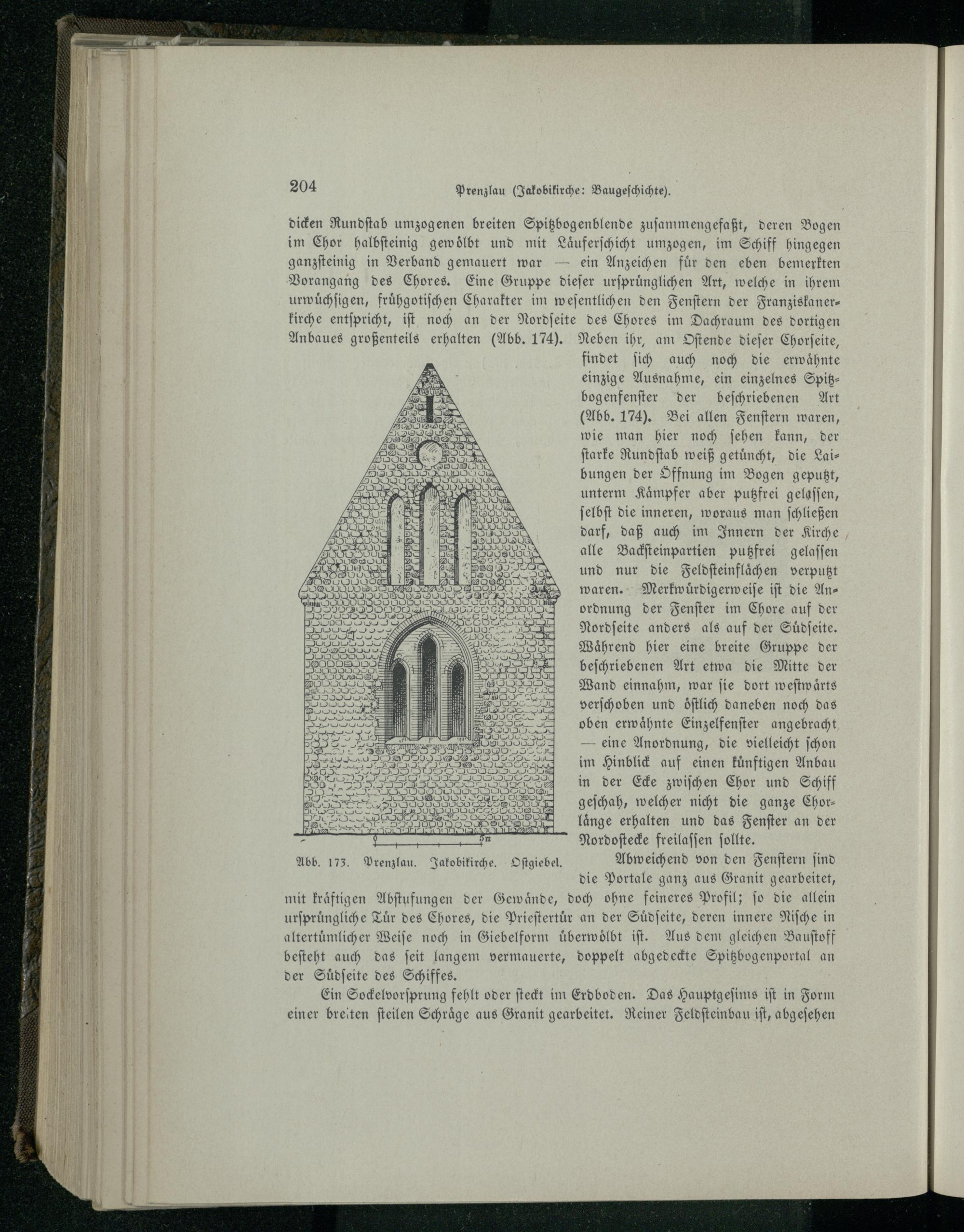 Nordſeite anders als auf der Suͤdſeite. Waͤhrend hier eine breite Gruppe der beſchriebenen Art etwa die Mitte der Wand einnahm, war ſie dort weſtwaͤrts verſchoben und oͤſtlich daneben noch das oben erwaͤhnte Einzelfenſter angebracht — eine Anordnung, die vielleicht ſchon im Hinblick auf einen kuͤnftigen Anbau in der Ecke zwiſchen Chor und Schiff ;; geſchah, welcher nicht die ganze Chorn,. 8 Sy laͤnge erhalten und das Fenſter an der Nordoſtecke freilaſſen ſollte. Abb. 173. Prenzlau. Jakobikirche. Oſtgiebel. Abweichend von den Fenſtern ſind die Portale ganz aus Granit gearbeitet, mit kraͤftigen Abſtufungen der Gewaͤnde, doch ohne feineres Profil;{vo die allein urſpruͤngliche Tür des Chores, die Prieſtertuͤr an der Suͤdſeite, deren innere Niſche in altertuͤmlicher Weiſe noch in Giebelform uͤberwoͤlbt iſt. Aus dem gleichen Bauſtoff beſteht auch das ſeit langem vermauerte, doppelt abgedeckte Spitzbogenportal an der Suͤdſeite des Schiffes. Ein Sockelvorſprung fehlt oder ſteckt im Erdboden. Das Hauptgeſims iſt in Form einer breiten ſteilen Schraͤge aus Granit gearbeitet. Reiner Feldſteinbau iſt, abgeſehen