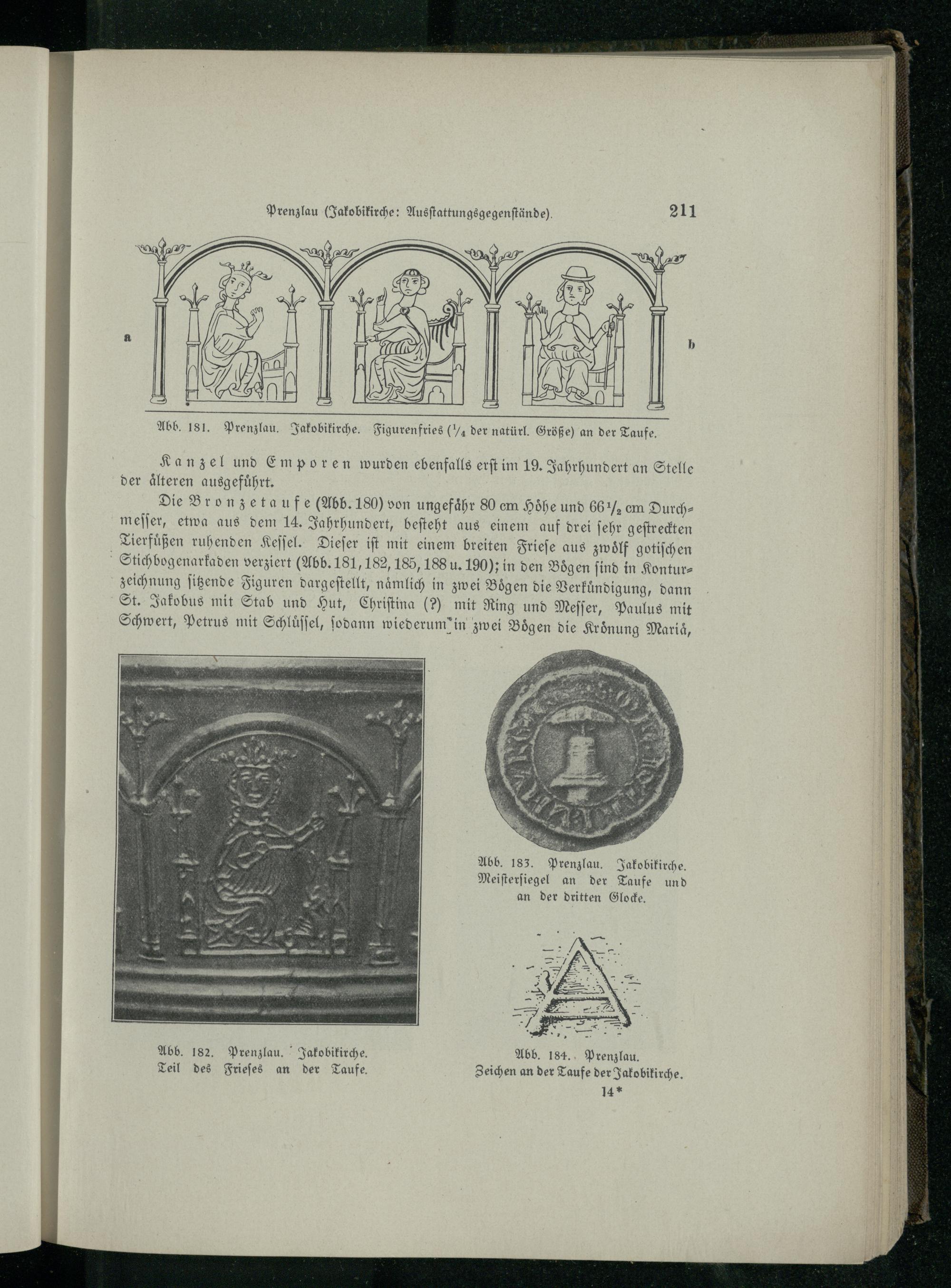 Abb. 182. Prenzlau. Jakobikirche. Abb. 184. Prenzlau. Teil des Frieſes an der Taufe. Zeichen an der Taufe der Jakobikirche. 14*
