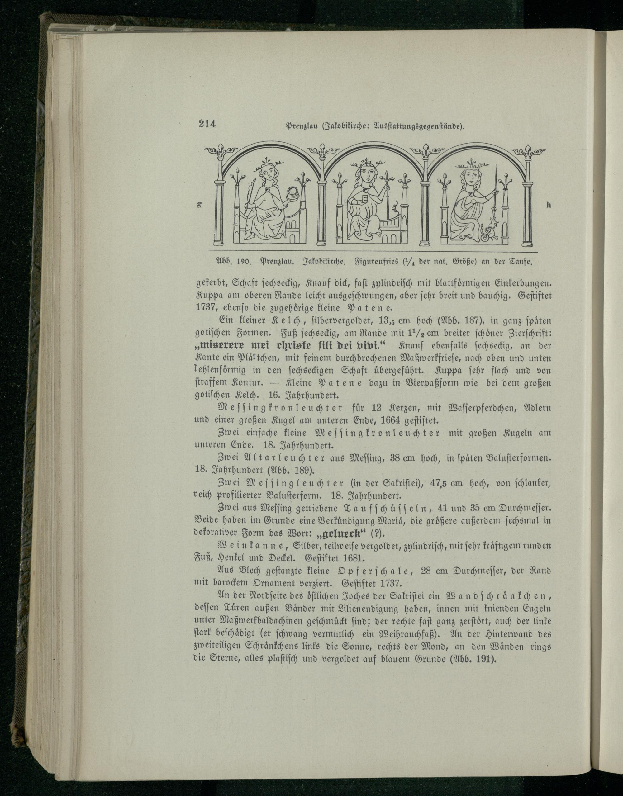 Ein kleiner Kelch, ſilbervergoldet, 13,5 em hoch(Abb. 187), in ganz ſpaͤten gotiſchen Formen. Fuß ſechseckig, am Rande mit 11/2 em breiter ſchoͤner Zierſchrift: „miserere mei rhriske fili dei vivi.“ Knauf ebenfalls ſechseckig, an der Kante ein Plaͤttchen, mit feinem durchbrochenen Maßwerkfrieſe, nach oben und unten kehlenfoͤrmig in den ſechseckigen Schaft uͤbergefuͤhrt. Kuppa ſehr flach und von ſtraffem Kontur.— Kleine Patene dazu in Vierpaßform wie bei dem großen gotiſchen Kelch. 16. Jahrhundert.