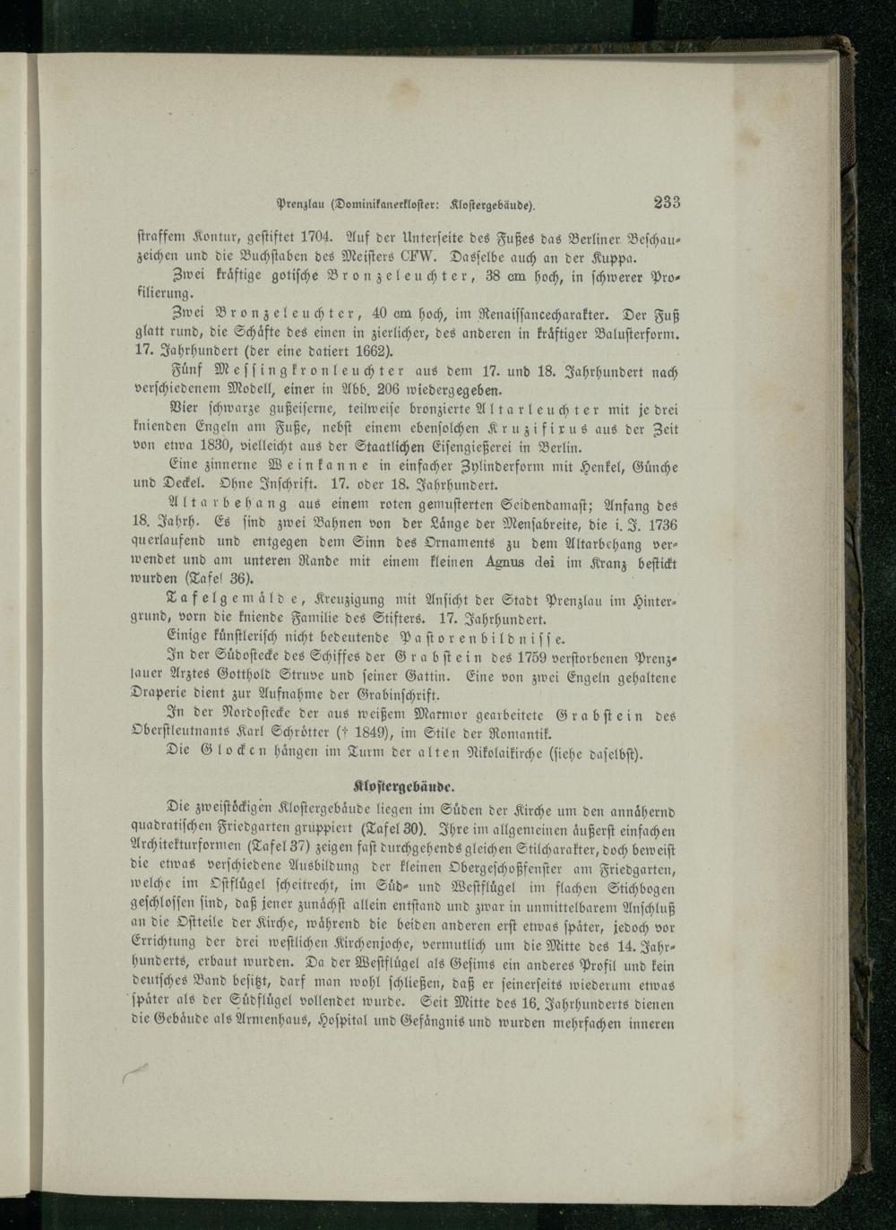 Die zweiſtoͤckigen Kloſtergebaͤude liegen im Suͤden der Kirche um den annaͤhernd quadratiſchen Friedgarten gruppiert(Tafel 30). Ihre im allgemeinen aͤußerſt einfach en Architekturformen(Tafel 37) zeigen faſt durchgehends gleichen Stilcharakter, doch beweiſt die etwas verſchiedene Ausbildung der kleinen Obergeſchoßfenſter am Friedgarten, welche im Oftflügel ſcheitrecht, im Suͤd⸗ und Weſtfluͤgel im flachen Stichbogen geſchloſſen ſind, daß jener zunaͤchſt allein entſtand und zwar in unmittelbarem Anſchluß an die Oſtteile der Kirche, waͤhrend die beiden anderen erſt etwas ſpaͤter, jedoch vor Errichtung der drei weſtlichen Kirchenjoche, vermutlich um die Mitte des 14. Jahr— hunderts, erbaut wurden. Da der Weſtfluͤgel als Geſims ein anderes Profil und kein deutſches Band beſitzt, darf man wohl ſchließen, daß er ſeinerſeits wiederum etwas ſpaͤter als der Suͤdfluͤgel vollendet wurde. Seit Mitte des 16. Jahrhunderts dienen die Gebaͤude als Armenhaus, Hoſpital und Gefaͤngnis und wurden mehrfachen inneren