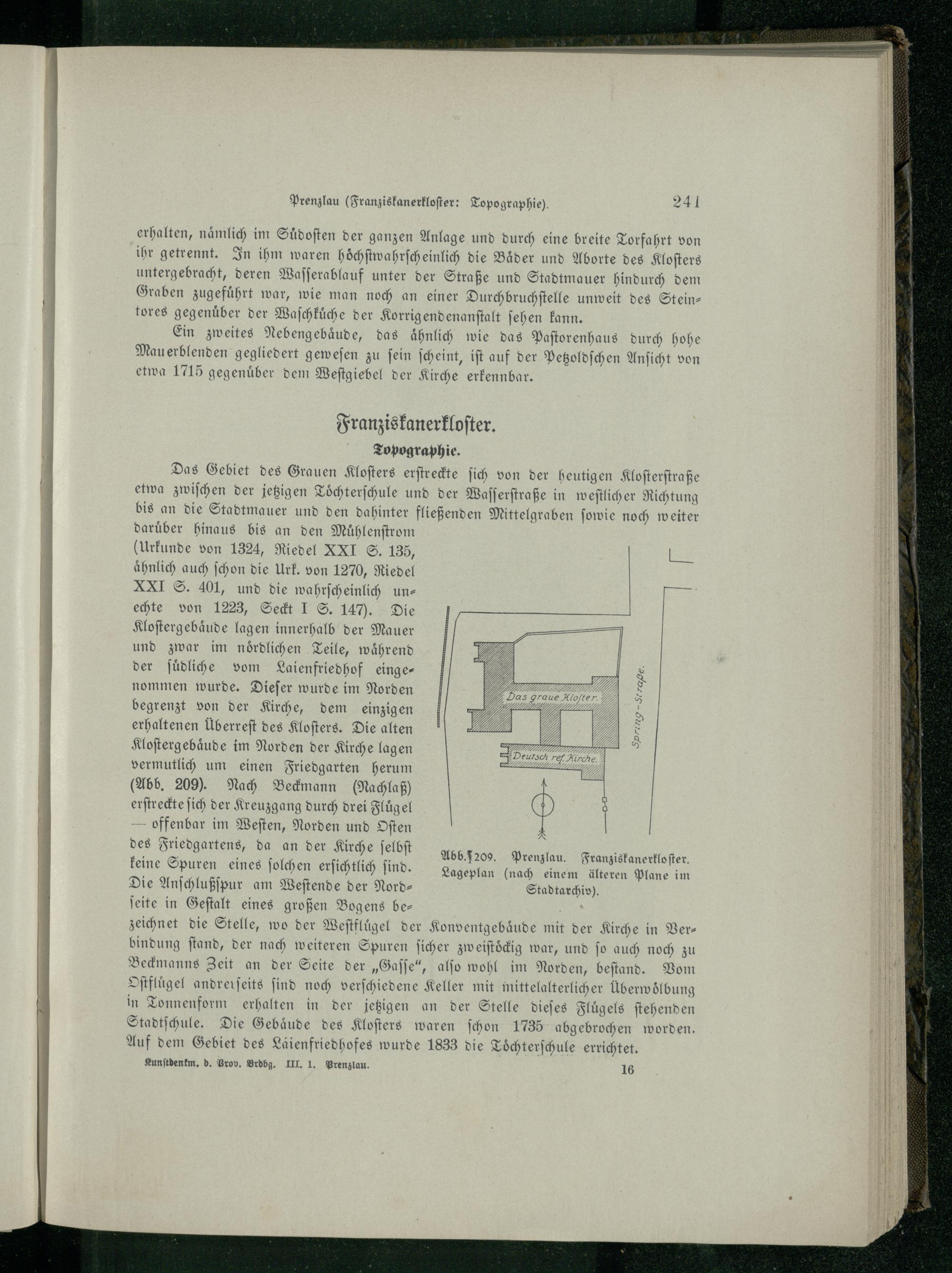 Das Gebiet des Grauen Kloſters erſtreckte ſich von der heutigen Kloſterſtraße etwa zwiſchen der jetzigen Toͤchterſchule und der Waſſerſtraße in weſtlicher Richtung bis an die Stadtmauer und den dahinter fließenden Mittelgraben ſowie noch weiter darüber hinaus bis an den Muͤhlenſtrom