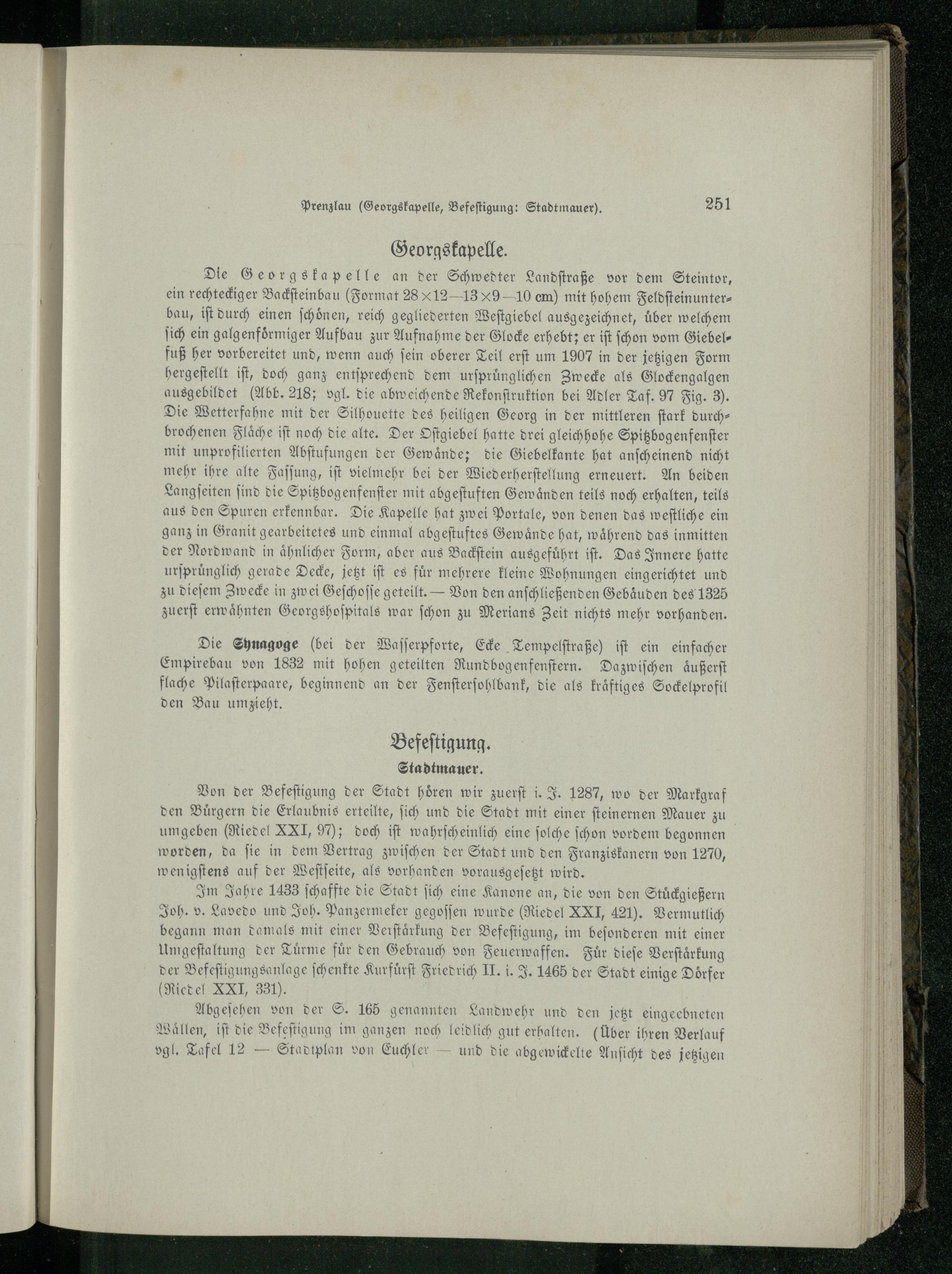 Die Georgskapelle an der Schwedter Landſtraße vor dem Steintor, ein rechteckiger Backſteinbau(Format 28*12–= 13 9 10 em) mit hohem Feldſteinunterbau, iſt durch einen ſchoͤnen, reich gegliederten Weſtgiebel ausgezeichnet, über welchem ſich ein galgenfoͤrmiger Aufbau zur Aufnahme der Glocke erhebt; er iſt ſchon vom Giebelfuß her vorbereitet und, wenn auch fein oberer Teil erſt um 1907 in der jetzigen Form hergeſtellt iſt, doch ganz entſprechend dem urſpruͤnglichen Zwecke als Glockengalgen ausgebildet(Abb. 218; ogl. die abweichende Rekonſtruktion bei Adler Taf. 97 Fig. 3. Die Wetterfahne mit der Silhouette des heiligen Georg in der mittleren ſtark durchbrochenen Flaͤche iſt noch die alte. Der Oſtgiebel hatte drei gleichhohe Spitzbogenfenſter mit unprofilierten Abſtufungen der Gewaͤnde; die Giebelkante hat anſcheinend nicht mehr ihre alte Faſſung, iſt vielmehr bei der Wiederherſtellung erneuert. An beiden Langſeiten ſind die Spitzbogenfenſter mit abgeſtuften Gewaͤnden teils noch erhalten, teils aus den Spuren erkennbar. Die Kapelle hat zwei Portale, von denen das weſtliche ein ganz in Granit gearbeitetes und einmal abgeſtuftes Gewaͤnde hat, wahrend das inmitten der Nordwand in aͤhnlicher Form, aber aus Backſtein ausgefuͤhrt iſt. Das Innere hatte urſpruͤnglich gerade Decke, jetzt iſt es für mehrere kleine Wohnungen eingerichtet und zu dieſem Zwecke in zwei Geſchoſſe geteilt.— Von den anſchließenden Gebaͤuden des 1325 zuerſt erwaͤhnten Georgshoſpitals war ſchon zu Merians Zeit nichts mehr vorhanden.