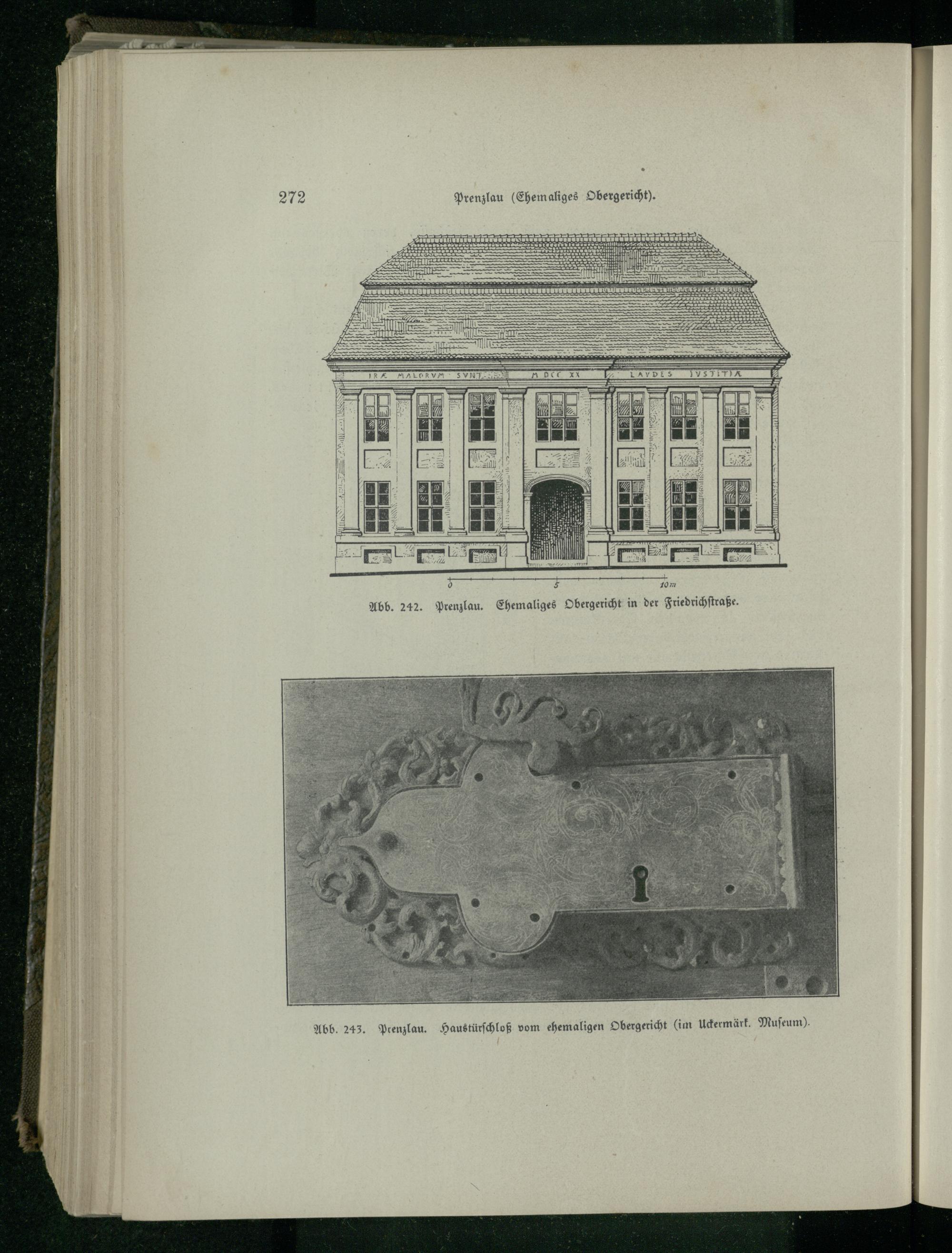 272 Prenzlau ( Ehemaliges Obergericht). IRA MALORVM SVNTARES MDCC XX LAVDES IVSTITIA MAR wwwww 10m Abb. 242. Prenzlau. Ehemaliges Obergericht in der Friedrichstraße. 2 Abb. 243. Prenzlau . Haustürschloß vom ehemaligen Obergericht( im Uckermärk. Muſeum).